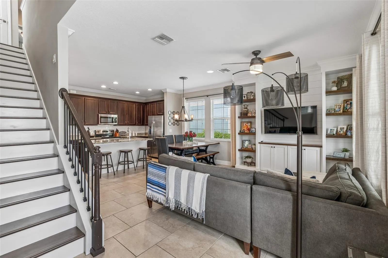 - Ceiling Fans(s), Crown Molding, Walk-In Closet(s), Kitchen/Family Room Combo, Split Bedroom, Window Treatments, High Ceilings, Solid Surface Counters, In Wall Pest System, Tray Ceiling(s), PrimaryBedroom Upstairs