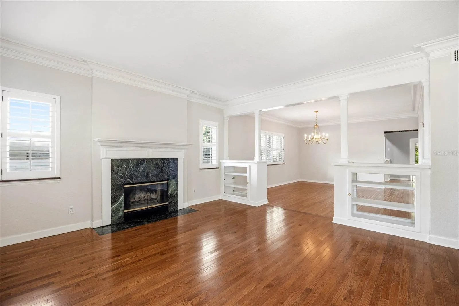 - Crown Molding, Living Room/Dining Room Combo, Primary Bedroom Main Floor, Stone Counters