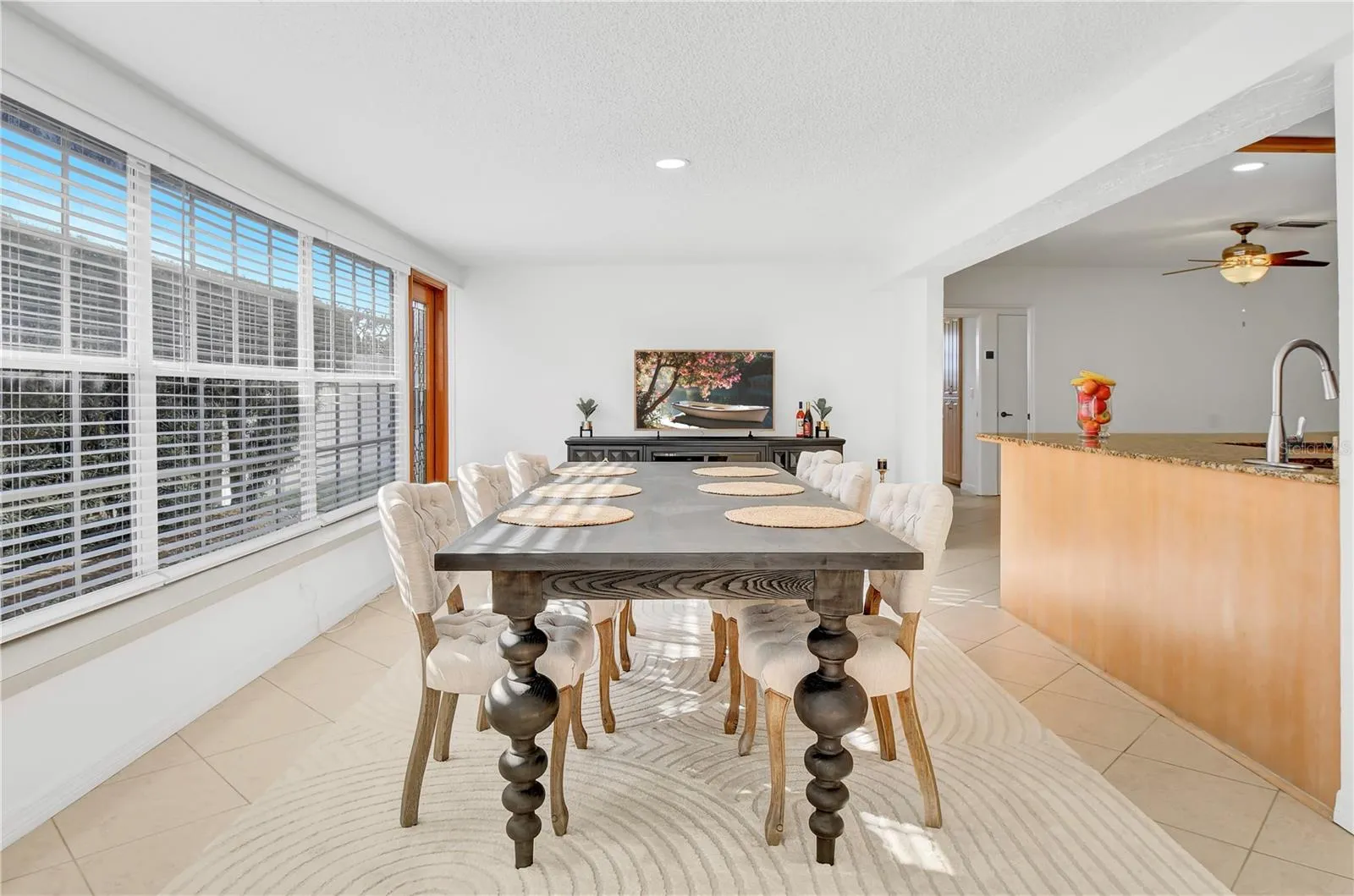 - Ceiling Fans(s), Thermostat, Living Room/Dining Room Combo, Split Bedroom, Window Treatments, Solid Surface Counters