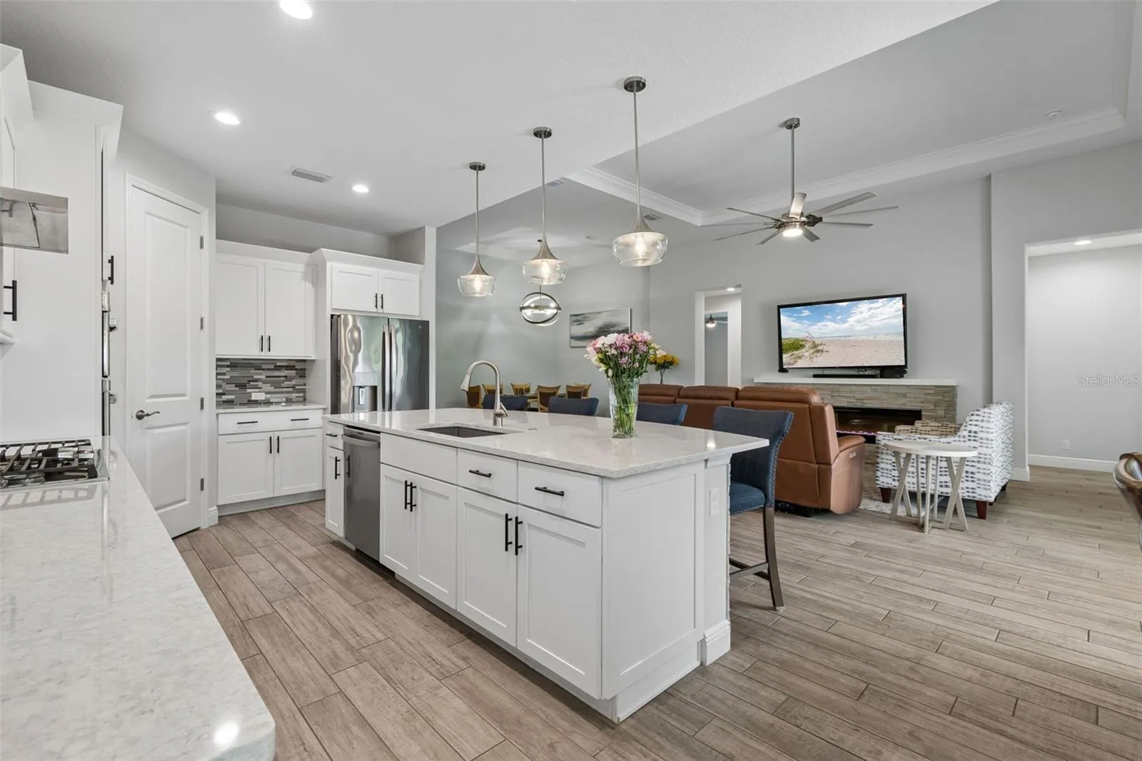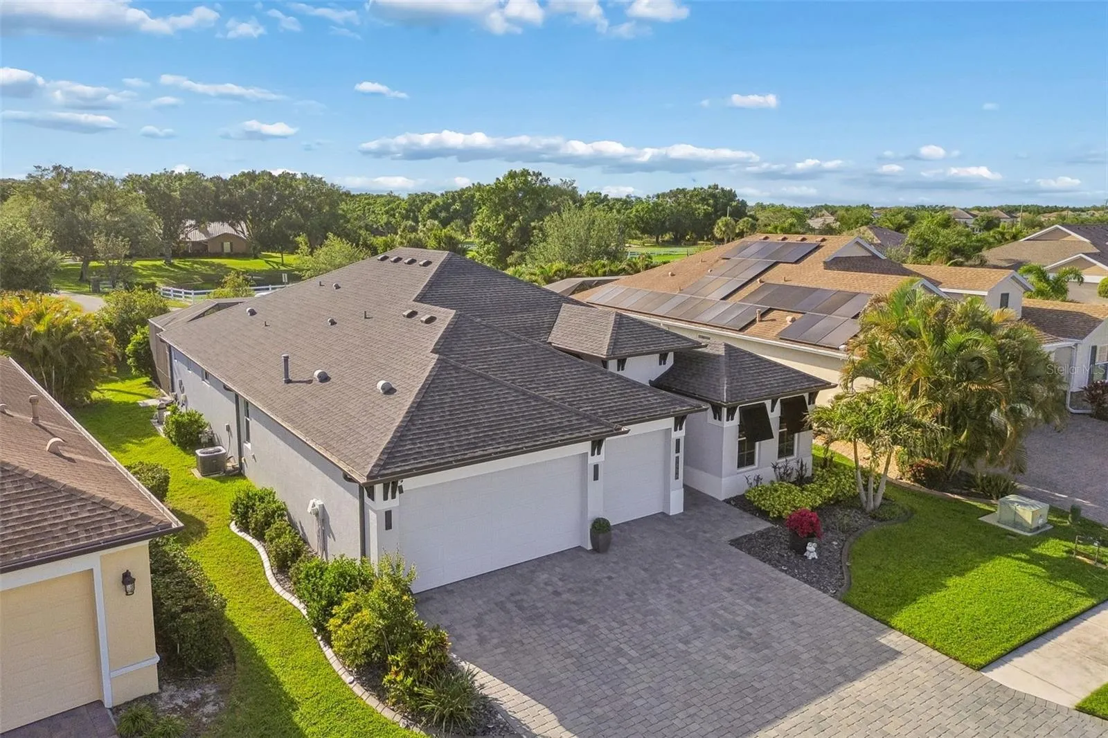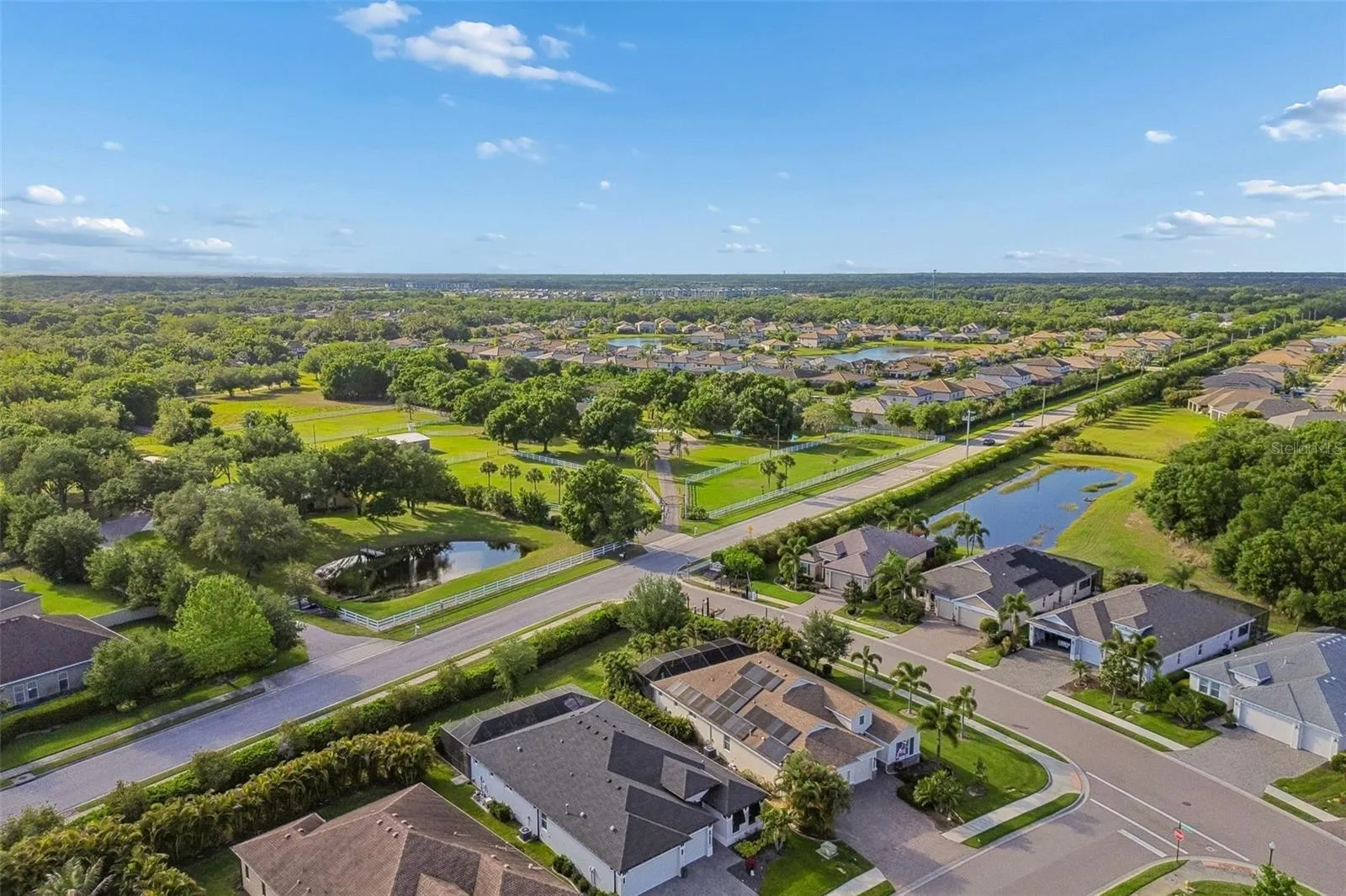 Welcome to this Sam Rodgers charming West Indies style exterior, Captiva floor plan designed for both entertaining and retreat. A beautifully stylish home, 3 Bedrooms, Den/office, 2.5 Bathrooms, and a 3-car garage, offering effortless and seamless connectivity to the screen enclosed outdoor living space with sparkling heated pool and summer kitchen for entertainment and relaxation. Inside, a light filled gallery opens to an interior defined by soaring ceilings, while warm finishes and a fireplace create an inviting atmosphere throughout. A well-appointed chef’s kitchen with central island, quartz counters, SS appliances, gas cooktop w/hood vent, built-in convection oven & microwave, walk-in pantry, glass tile backsplash, loads of dovetail wood cabinetry, and cafe area. The luxurious primary suite with spa-inspired bath delivers a true private, comfortable retreat with dual vanities, walk-in shower, and large custom walk-in closet you don’t want to walk out of. Just off the gallery, 2 sizable guest bedrooms share a full bath; while on the opposite side of home there’s a 1/2 bath just off the great room, a den/office and full size laundry room. Notable features include ALL hurricane impact windows and sliders, 50 amp charging outlet for electric vehicles, neutral color palette throughout, tile in main living areas, carpeted bedrooms, custom wallpaper, custom wall tile, tray ceilings, crown molding, beautiful lighting and fan fixtures. Located in Greyhawk Landing West, a community filled with amenities … tennis courts, pickleball courts, biking/walking trails, lighted basketball courts, soccer field, baseball field, fishing pier, clubhouse, 2 community pools, fitness center, and low HOA fees! Convenient access to I-75, Lakewood Ranch, The Market Place at Heritage Harbor, dining, shopping and Gulf beaches.