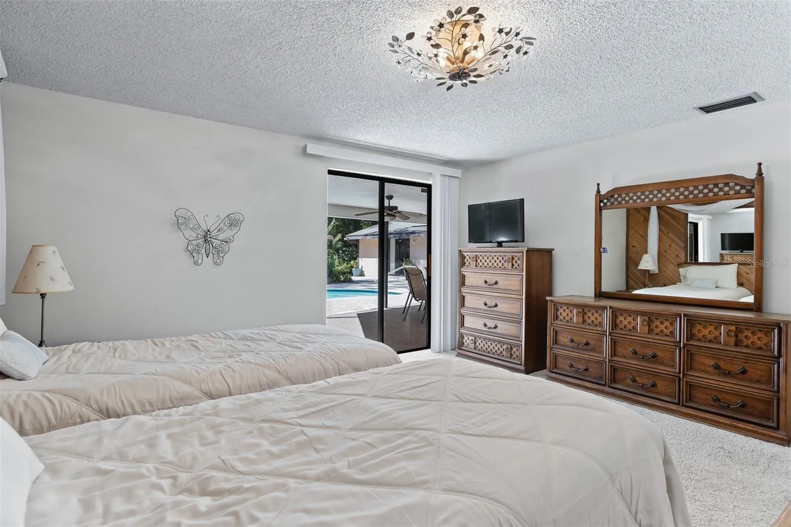 The oversized primary suite offers a relaxing escape with an ensuite bathroom, walk-in closet, and private sliders leading out to the pool. Laminate flooring flows through the main living areas, one guest bedroom, and the in-law suite, while the remaining bedrooms feature carpet and the kitchen and bathrooms are finished with tile.