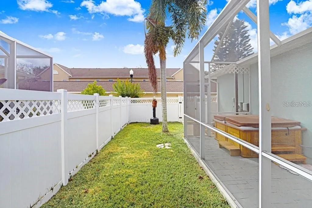 Live the Westchase lifestyle in this beautifully appointed END-UNIT villa with tranquil pond views from your charming front porch. Tucked in the heart of West Park Village, this thoughtfully designed home offers 2 bedrooms + a dedicated office/den (with built-in Murphy bed) + 2 full baths—living like a true 3-bedroom when guests come to stay. Rich engineered hardwood floors, soaring tray ceilings, and plantation shutters throughout create an elevated, move-in-ready feel. The kitchen shines with granite countertops, wood cabinetry, and stainless steel appliances—perfect for everyday living or entertaining. The private primary retreat is tucked at the rear of the home, featuring a tray ceiling, custom walk-in closet, dual-vanity bath, and oversized walk-in shower with frameless glass and a private water closet. A true two-way split floor plan places Bedroom 2 in its own private wing with full bath—ideal for guests, roommates, or multigenerational living. Step outside to a screened back patio with stamped concrete, hot tub, and fully fenced yard—your private oasis. Two-car alley-entry garage plus a two-car parking pad for added convenience. Exterior paint, roof, landscaping, and trash all included—spend your time enjoying the community, not maintaining it. Residents enjoy Westchase’s two Swim & Tennis Centers, pickleball courts, parks, playgrounds, and miles of scenic trails, with walkable access to West Park Village’s shops, restaurants, and everyday essentials. Zoned for top-rated Westchase Elementary, Davidsen Middle, and Alonso High. Minutes to the Veterans Expressway, Upper Tampa Bay Trail, and Tampa International Airport. A rare opportunity to live the Westchase dream—turnkey, low-maintenance, and unbeatably located.