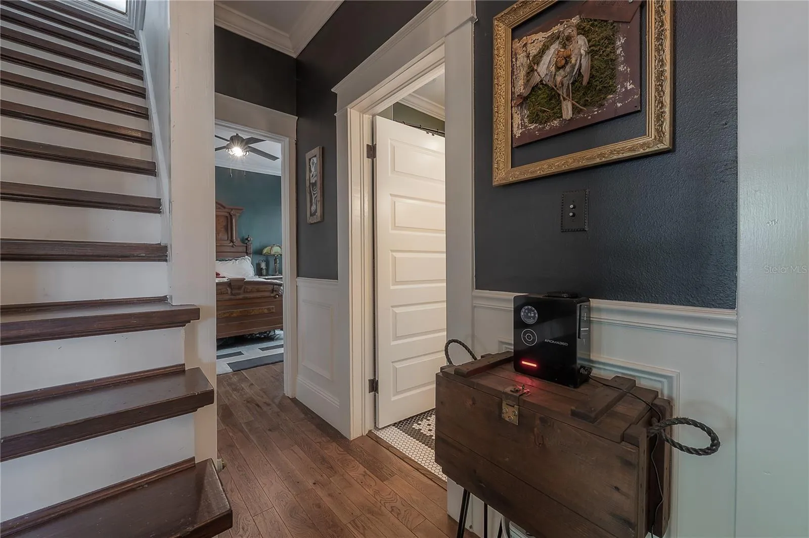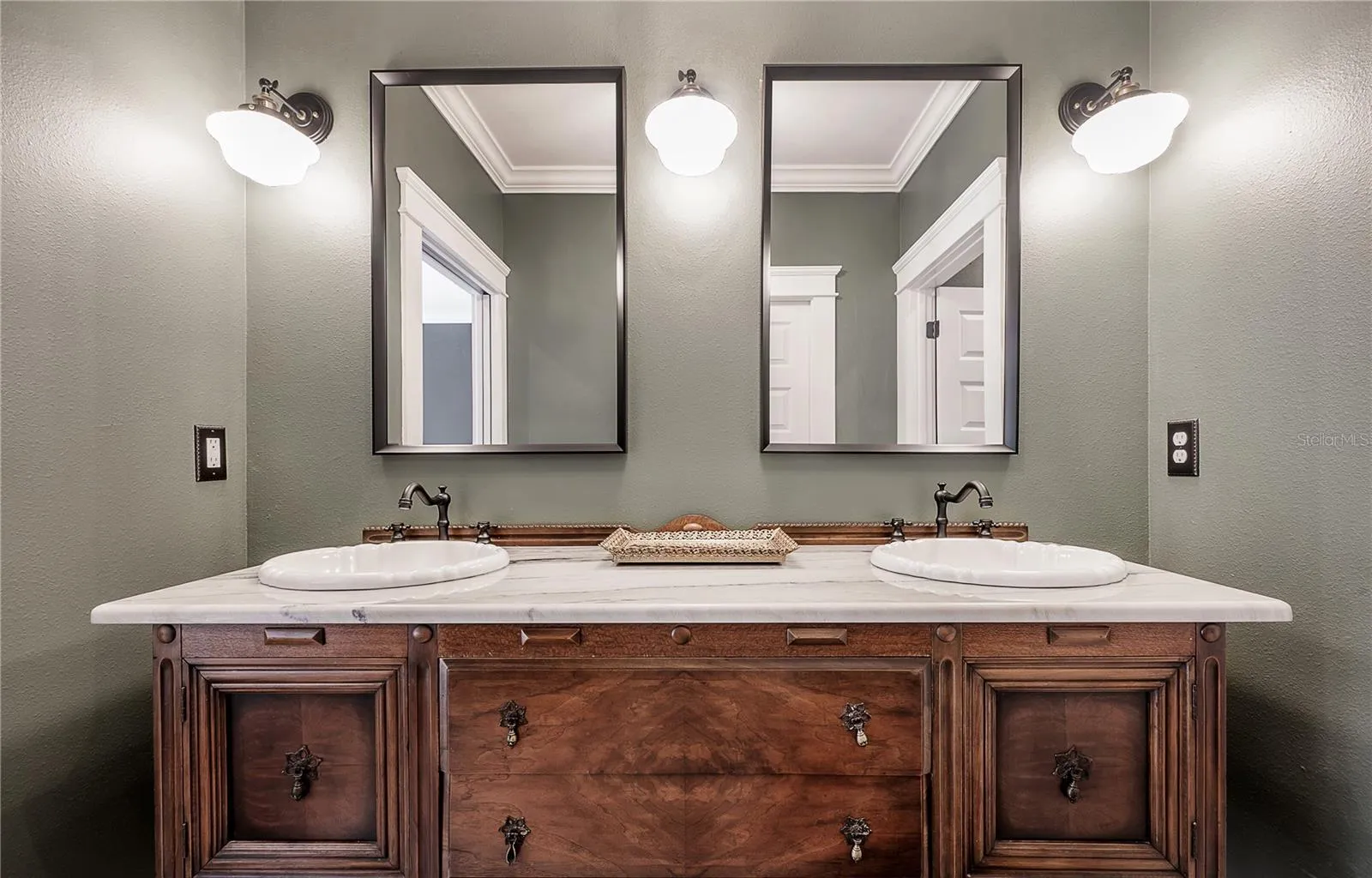 There are homes you just pass by… then ones that make you slow down. Welcome to this one-of-a-kind 1920s Craftsman bungalow—a Southern dream wrapped in charm, history, unmistakable presence. Set on a large, beautifully landscaped corner lot, this home captivates at first glance. A sweeping 418-square-foot wraparound porch, framed by mature greenery & blooming crape myrtles, creates that rare curb appeal that feels unforgettable. It’s the kind of home neighbors admire, & passersby remember. Step inside, & the story deepens. Interiors evoke a New Orleans-inspired mood—rich, layered, & inviting. A palette of warm charcoals & deep greens creates an intimate, moody ambiance, softened by natural light streaming through abundant windows dressed in plantation shutters. Historic character shines in the details: intricate trim work, coffered ceilings, box trim wainscoting, & five-piece molding around windows & doors. Decorative medallions & eclectic light fixtures with antique push-button switches punctuate each space, while original-style five-panel Craftsman doors, complete with vintage glass knobs, brass backplates, & skeleton keys, offer a tactile connection to the home’s heritage. Warm brown hardwood flooring runs throughout, grounding each space with richness & continuity. At the heart of the home, the kitchen is both refined & functional. White shaker cabinetry with crown molding & glass panel accents is paired with under-cabinet lighting, brass hardware, & vintage-inspired backsplash. White marble countertops elevate the space, beautifully complementing the brass bridge-style faucet & stainless steel apron-front sink. GE Café Series appliances, a gas cooktop, wall oven, & dedicated beverage refrigerator complete the space. The living areas are warm & welcoming, centered around a functioning gas fireplace.