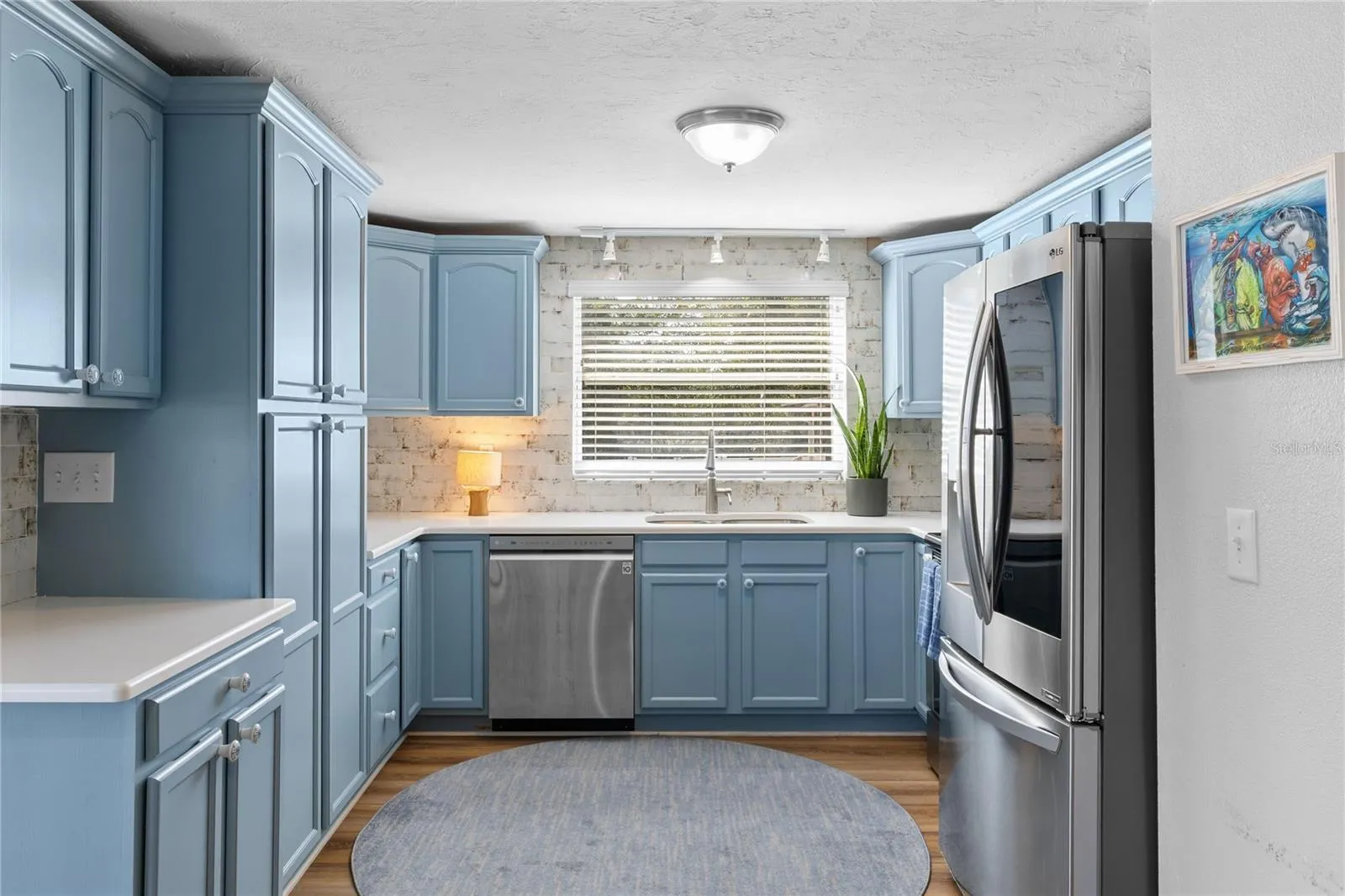The bright, coastal inspired kitchen features white quartz countertops, a tile backsplash, and coastal style cabinetry, creating a fresh and inviting space to gather. Step outside to a peaceful screened in patio where you can relax, unwind, and take in the tropical setting overlooking the canal and spacious backyard, with plenty of room to add a pool.