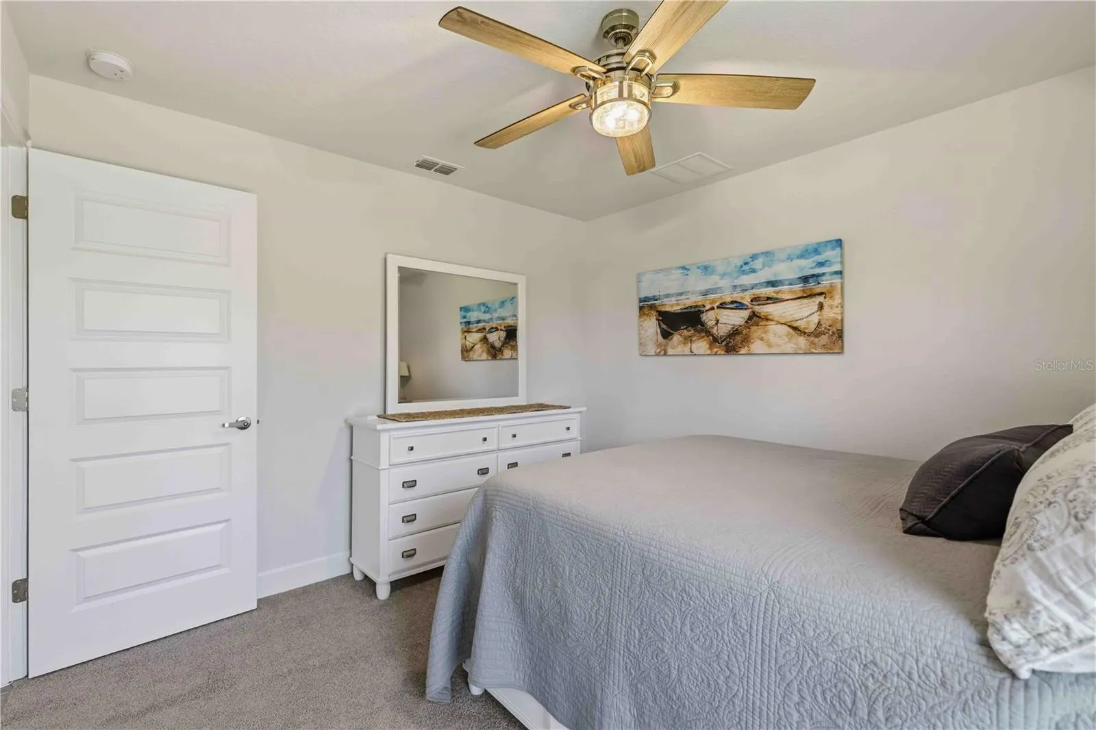 The primary bedroom is strategically located on the opposite side of the house for ultimate privacy, offering tranquil views of the water. The en-suite bathroom features double vanities and a walk-in closet, ensuring comfort and convenience. Secondary bedrooms are equally impressive, each boasting walk-in closets. Two bedrooms share a Jack and Jill bathroom with double vanities, while the third bedroom offers a private suite, ideal for guests or extended family.