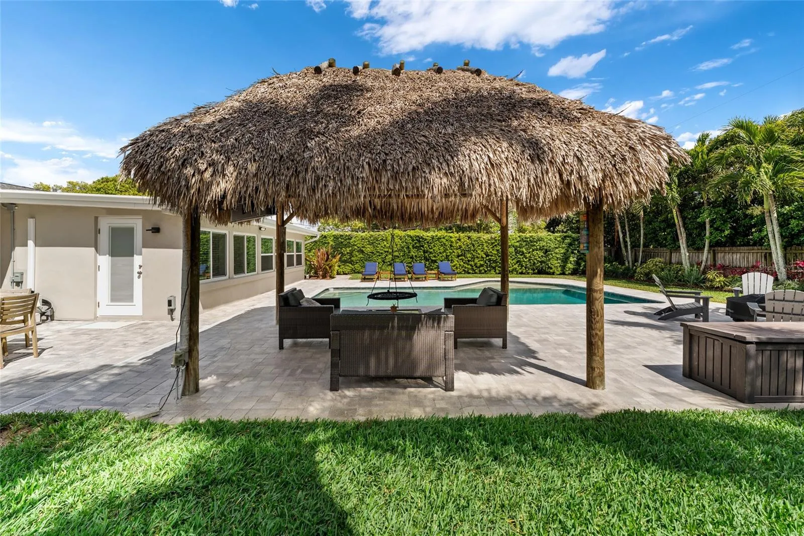 Step outside and discover what truly sets this property apart. Situated on an expansive 76 x 135 lot, the backyard is nothing short of spectacular—a true resort-style retreat. The centerpiece is a massive 16′ x 32′ pool with a PebbleTec finish and sunshelf, surrounded by an elegant paver deck. Whether you’re soaking up the Florida sun or entertaining friends, there’s ample space with a dedicated lounging area for four chairs, a cozy firepit, and a show-stopping 15′ x 18′ tiki hut complete with a ceiling fan and 50″ flat-screen TV.