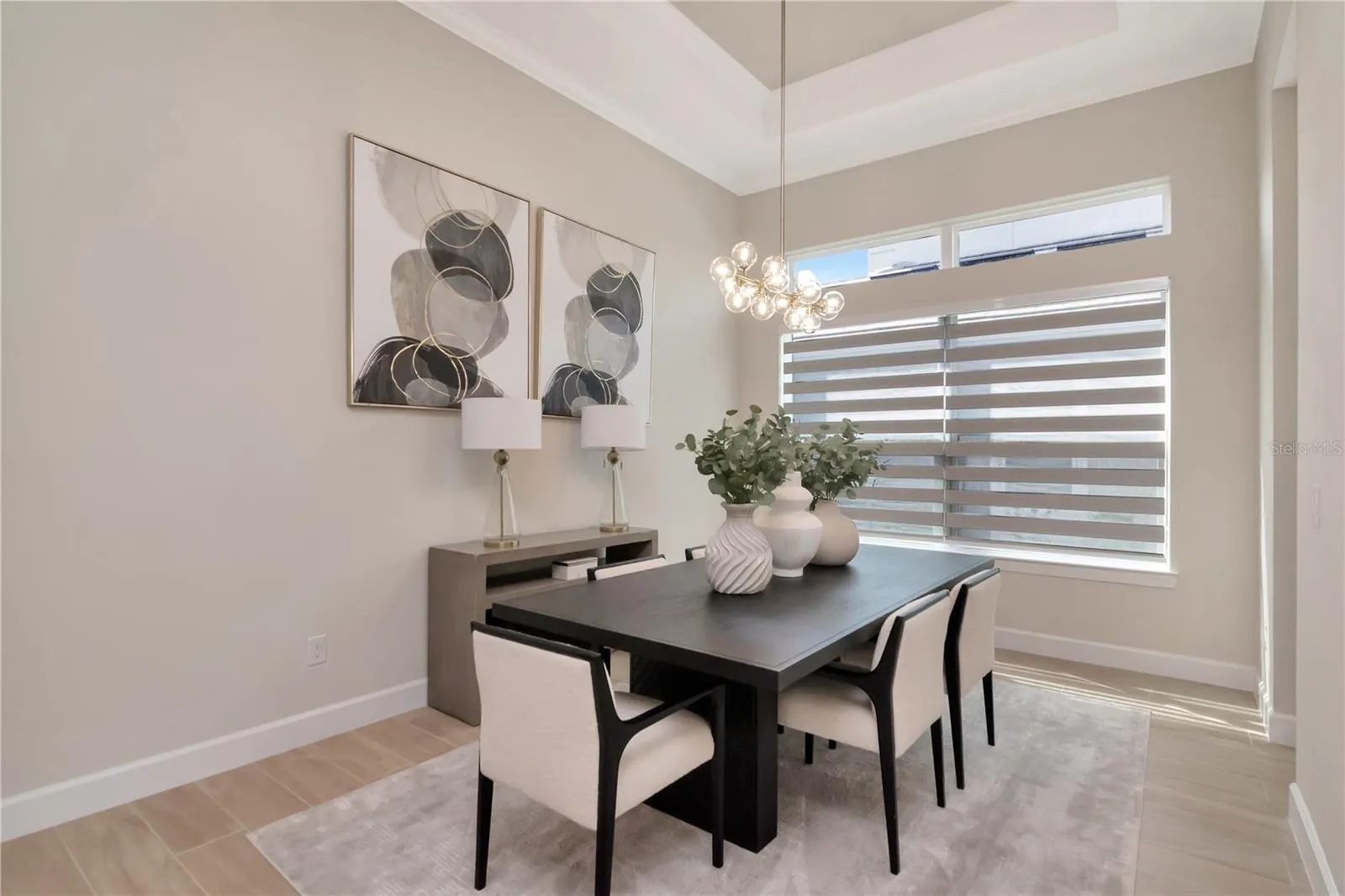 Perfectly positioned on a premium homesite, the property showcases a serene pond view, beautifully framed by expansive rear windows and dramatic sliding glass doors. Grand architectural details elevate this home from ordinary to extraordinary, from the pavered driveway to opening the elegant french glass-door entry to the breathtaking interior highlighted by soaring 12-foot ceilings, transom windows, and stately 8-foot interior doors. Stylish porcelain tile flows seamlessly throughout the main living areas, kitchen, and owner’s suite, creating a cohesive and luxurious ambiance.