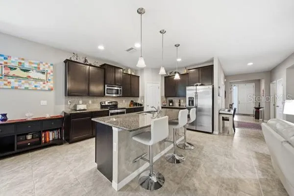 The kitchen is the heart of the home, featuring granite countertops, stainless steel appliances, abundant cabinetry, a large center island with bar seating, and pendant lighting, all overlooking the spacious living area—perfect for entertaining or everyday living.