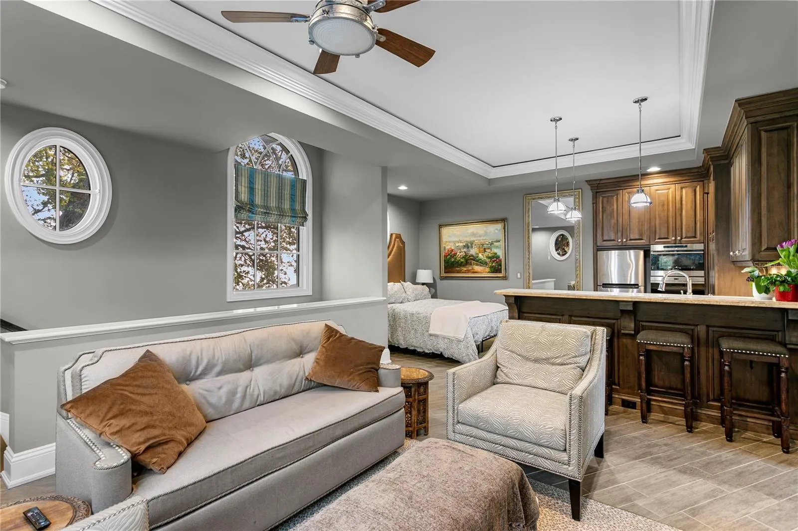 - Ceiling Fans(s), Elevator, Crown Molding, Open Floorplan, Thermostat, Walk-In Closet(s), Eat-in Kitchen, Primary Bedroom Main Floor, Window Treatments, High Ceilings, Vaulted Ceiling(s), Stone Counters, Smart Home, Solid Wood Cabinets, Solid Surface Counters, Cathedral Ceiling(s), Tray Ceiling(s), Wet Bar, PrimaryBedroom Upstairs, Coffered Ceiling(s)