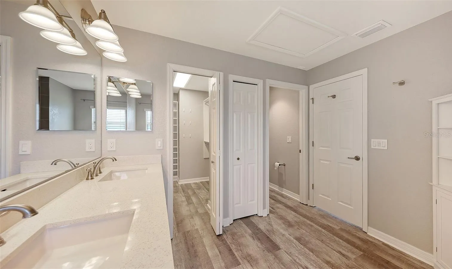 This charming home, filled with great details, boasts two stories and features 3 bedrooms, 2.5 bathrooms, and a 2-car garage. It is located in LIGHTHOUSE COVE AT HERITAGE HARBOUR, BRADENTON. The large great room makes it easy to entertain guests. The kitchen has stainless steel appliances, quartz countertops, and a large pantry. All three bedrooms are located upstairs, including a large primary suite with a custom-built-in walk-in closet, soaking tub, dual sinks, and a beautiful upgraded walk-in shower with the details. Luxury vinyl plank flooring is present on both the first level and the second-floor loft, flowing to the master bedroom and one of the guest room. The loft area can serve as a game space or be adapted for any other flexible use you desire. The covered and screened back porch offers a beautiful water view, making it an ideal spot for relaxation. Lighthouse Cove is an active, family-oriented community with access to a large park, sports fields, playgrounds, picnic areas, walking and biking trails, and a fishing pier. Stony Brook is a public golf course at Heritage Harbour. Enjoy beach activities on Anna Maria Island and Holmes Beach. There is quick access to I-75, facilitating an easy commute to Sarasota, St. Pete, and Tampa International Airport. You will find convenient access to UTC Mall, Lakewood Ranch, and the Ellenton Outlet Mall. Additionally, Costco’s new shopping center is just a few minutes’ driving distance. This home provides a welcoming environment perfect for creating lasting memories.