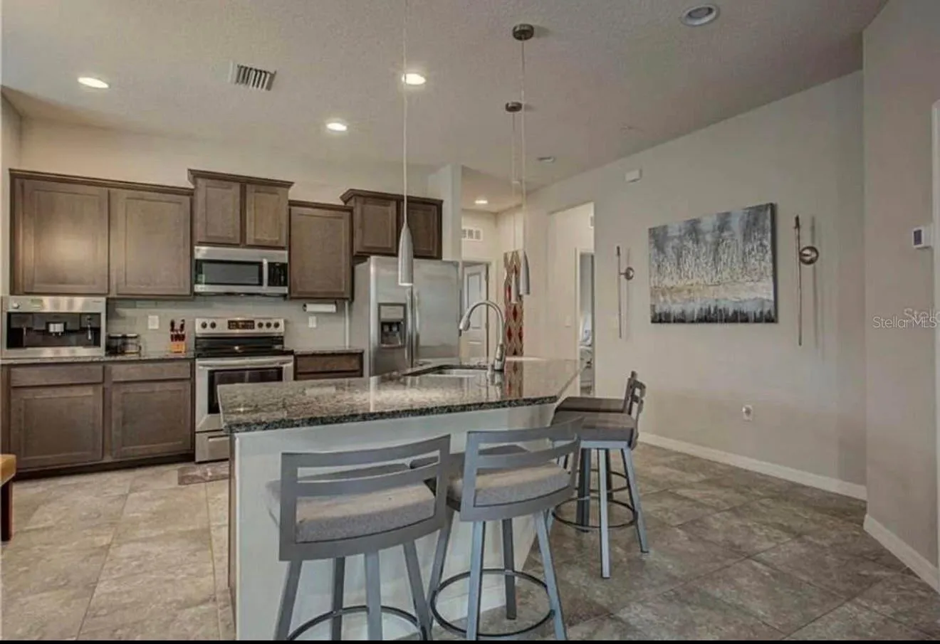 This light-filled residence features a modern open-concept layout with a stylish kitchen complete with stainless steel appliances, granite countertops, tile backsplash, and ample cabinet space perfect for both everyday living and entertaining.