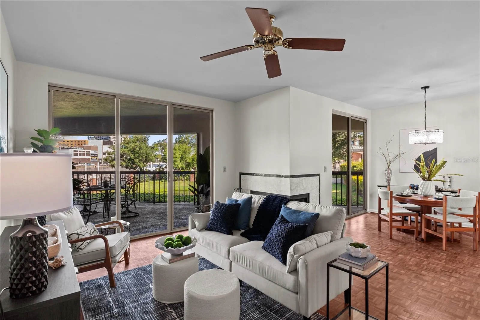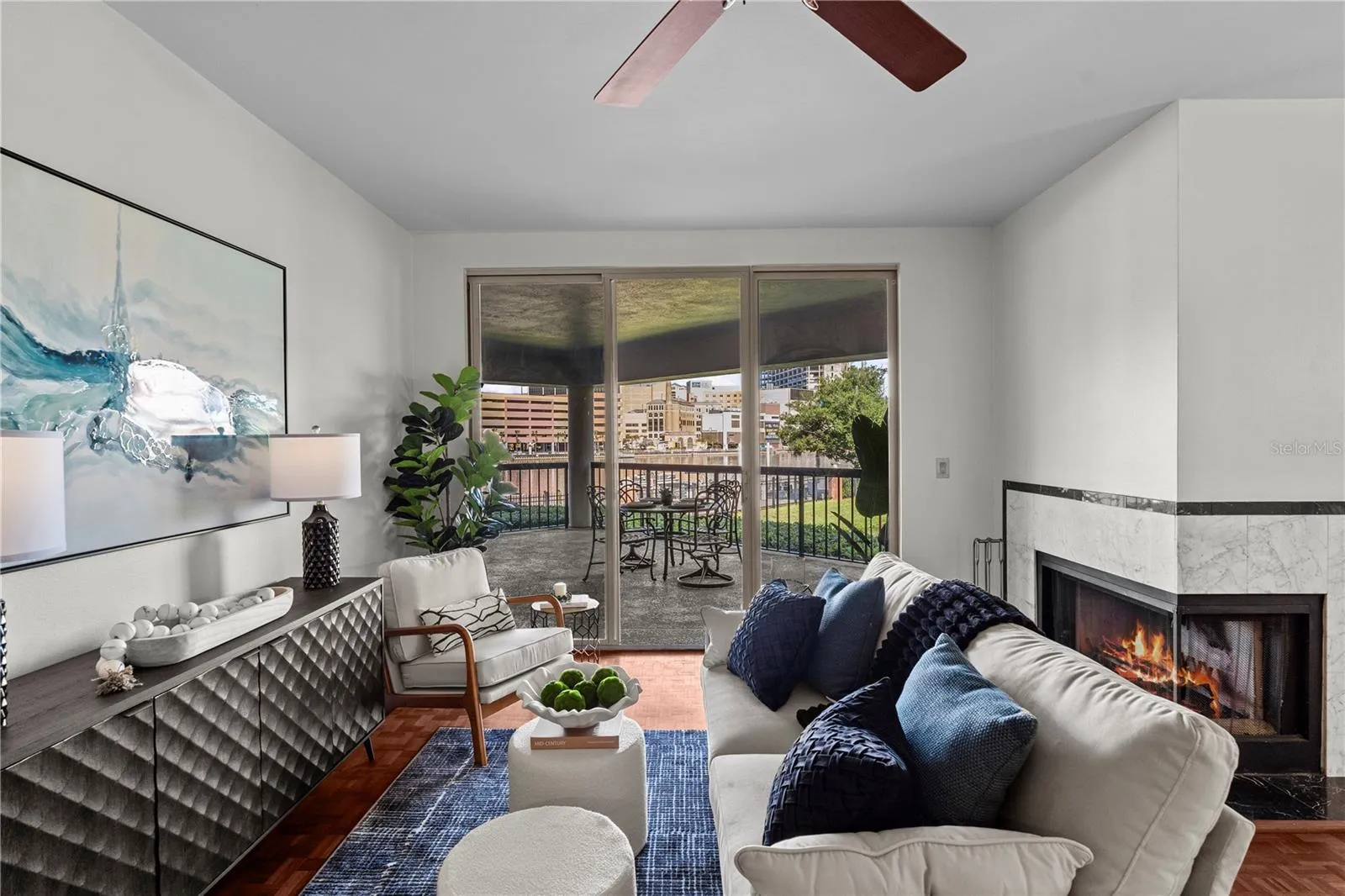 Step inside and immediately notice the warmth of rich parquet wood flooring complemented by elegant marble accents, creating a sophisticated yet inviting atmosphere. The spacious living area is anchored by a charming wood-burning fireplace—perfect for cozy evenings—and flows seamlessly out to the largest covered lanai in the building. From here, enjoy breathtaking water views, including a serene pond to the right, making it an ideal space for relaxing or entertaining.