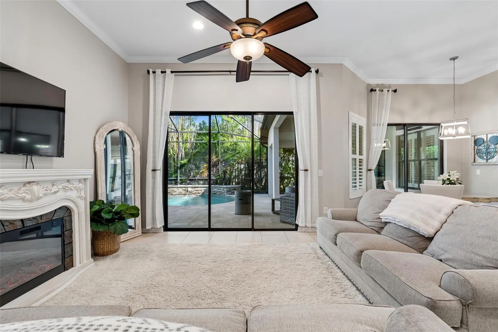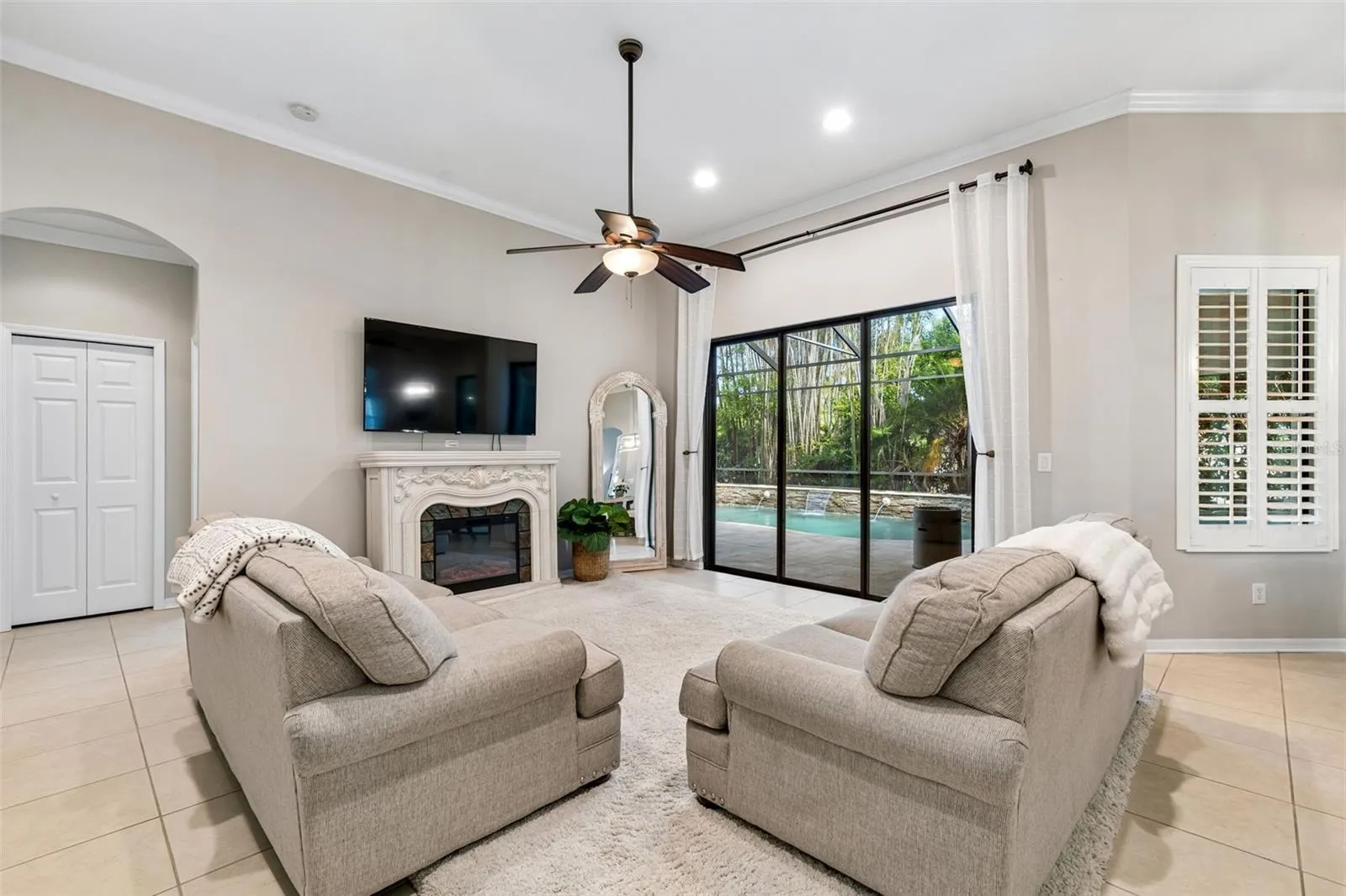 Rare opportunity to own a well-maintained single-story Taylor Morrison waterfront pool home with no rear neighbors, set on a private wooded homesite in the gated Waterbridge subdivision of Stonebrier in Lutz and zoned for top-rated schools including McKitrick, Martinez, and Steinbrenner. This home offers 4 bedrooms, a dedicated office, 3 full bathrooms, and an oversized 3-car wide garage with a functional 3-way split floor plan for privacy and flexibility. Recent updates include a brand-new dimensional shingle roof (2025) with transferable warranty, a newer HVAC system (2024), fresh landscaping, and fresh exterior paint. The screened lanai and outdoor living space span over 1,200 square feet and feature an expansive travertine deck, a heated saltwater Pebble-Tec pool, custom spillover spa, hand-cut stone wall with water features, custom pool lighting with app control, WiFi Aqualink system, and a new pool pump (2026), all overlooking peaceful conservation views and built for indoor-outdoor living. A brand-new 65-inch outdoor TV and sound bar will convey. The home offers strong curb appeal with a brick paver driveway and entry, stacked stone accents, upgraded landscaping with lighting, and a glass front entry door. Inside, the open layout features 13-foot double tray ceilings with crown molding, high ceilings throughout, updated interior paint, oversized ceramic tile flooring, decorative niches, plantation shutters, recessed lighting, a stacked stone accent wall, and abundant natural light throughout the main living areas, along with a private office with French doors and hardwood flooring. The family room features triple sliding glass doors opening to the pool and lanai. The primary suite is located on its own wing and offers tray ceilings, direct pool access, dual closets, and an en-suite bath with a walk-in shower, garden tub, dual sinks, makeup station, and private water closet. The kitchen includes granite countertops, 42-inch cabinetry, an oversized sink, breakfast bar seating, a dinette overlooking the pool, stainless steel appliances, a vented hood, and a new dishwasher (2025). Secondary bedrooms are generously sized with newer carpet, with two sharing a full bath, while the fourth bedroom is positioned at the rear with access to the third full bathroom, which also serves as a pool bath. The oversized 3-car garage includes two 4×8 overhead storage racks. Additional features include a laundry room with cabinet storage and a new utility sink. Stonebrier residents enjoy resort-style amenities including a zero-entry pool with splash area and waterslide, fitness center, playground, basketball courts, soccer and sports fields, and scenic lakes and conservation areas throughout the community. Pet-free home. Video and 3D home tour available.