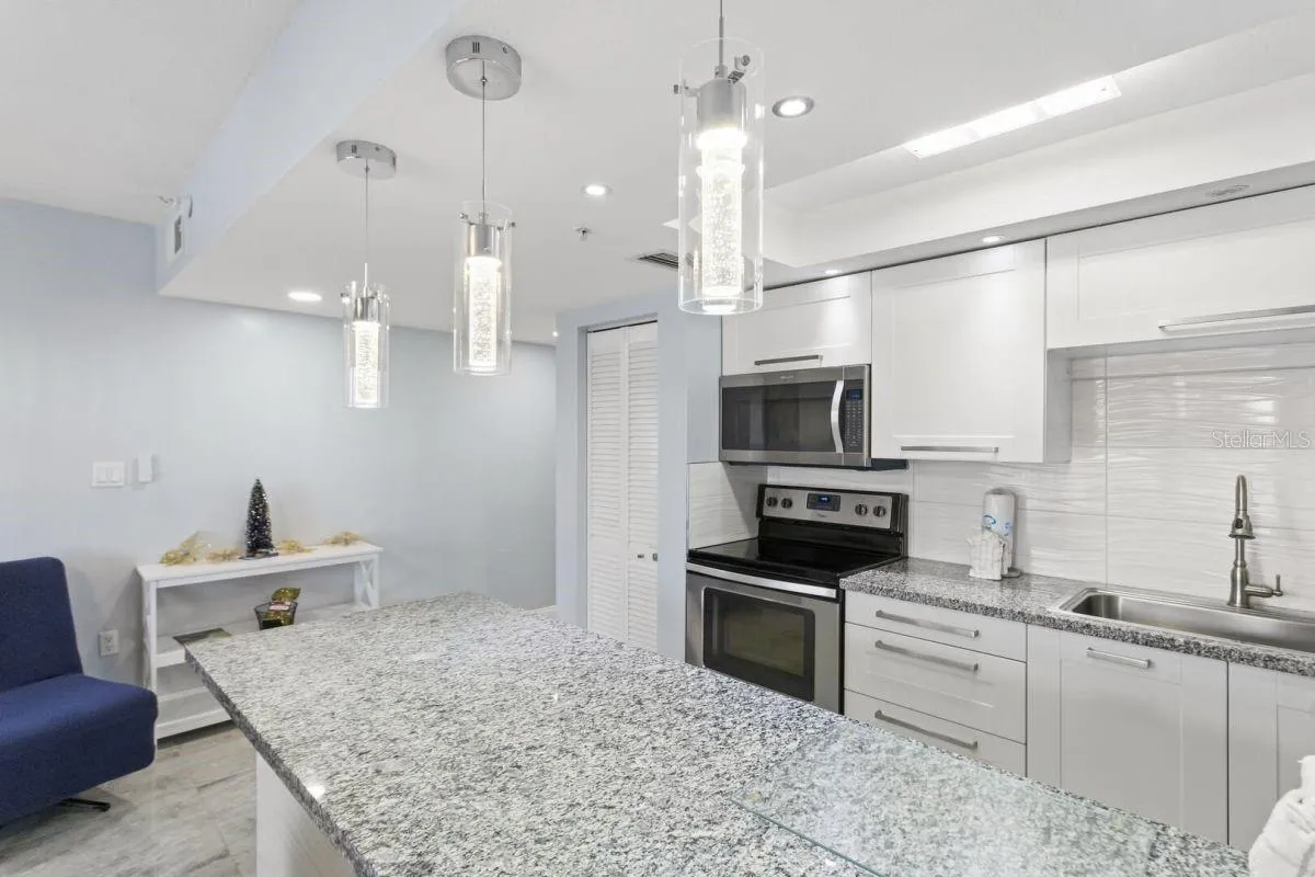 Your beachfront retreat is waiting for you! Fully remodeled condo right on the beach. This fully furnished property with breathtaking views of the Intracoastal is also located directly on the Gulf. Updated kitchen with granite counters, new luxury tile flooring, no popcorn ceilings or carpet, and a fully tiled bathroom with a large walk-in shower and extra-wide vanity. Additional features include a heated towel bar, updated furniture with a king-size bed, and a leather sleeper sofa.