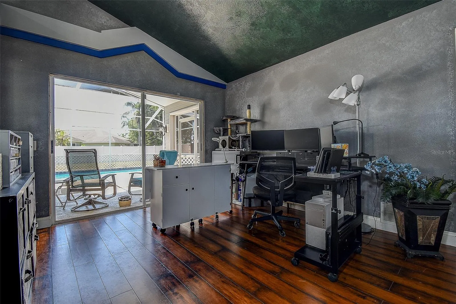 Enjoy a fully enclosed backyard with a privacy fence and a private pool enclosure, perfect for relaxing or entertaining. The outdoor space includes two sliding glass doors, a dog door, and direct access to a bathroom for added convenience.