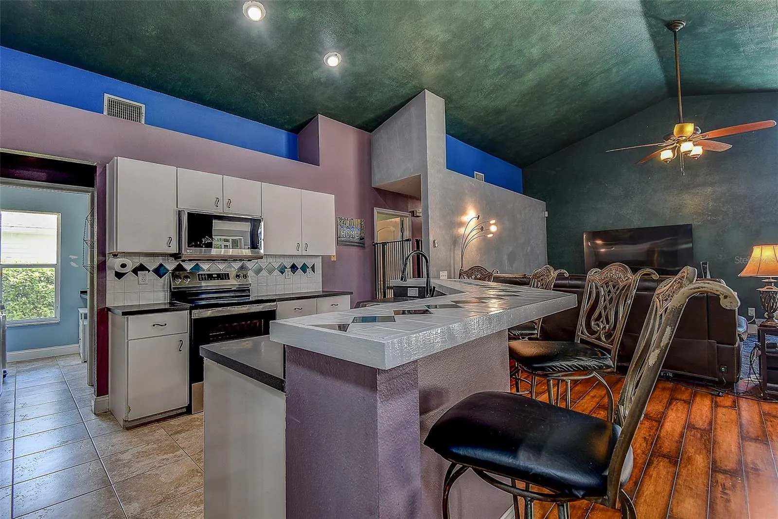 Step inside to discover a thoughtfully designed floor plan with spacious living areas that flow seamlessly into the kitchen and dining spaces, ideal for gatherings. The living room features vaulted ceilings, a wall nook, and sliding glass doors leading to the outdoor area, while a cozy breakfast nook includes a wall partition. The kitchen offers recessed lighting, a center island, bar seating, and updated appliances including a newer dishwasher, microwave, oven, and refrigerator, along with a modern faucet. A dedicated laundry room includes a built in counter, washer, and dryer.