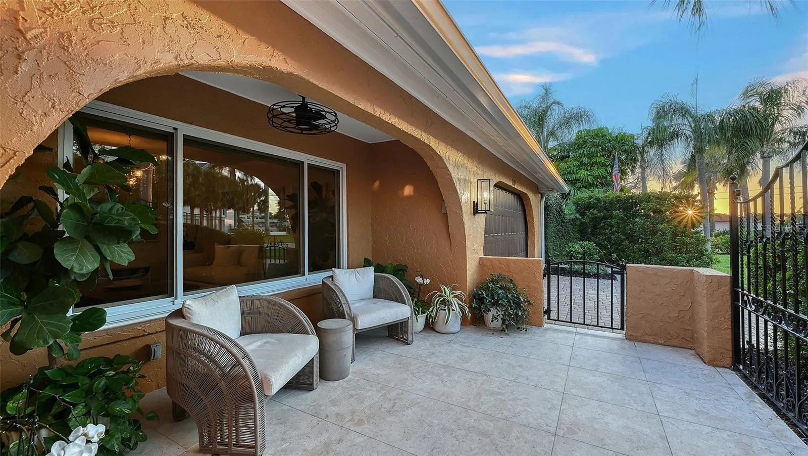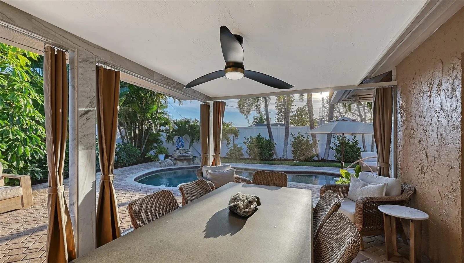 • Expansive panoramic-style covered lanai with new marble posts and beam, Sunbrella curtains, ceiling fan, and painted ceiling — perfect for serene mornings or elegant evenings