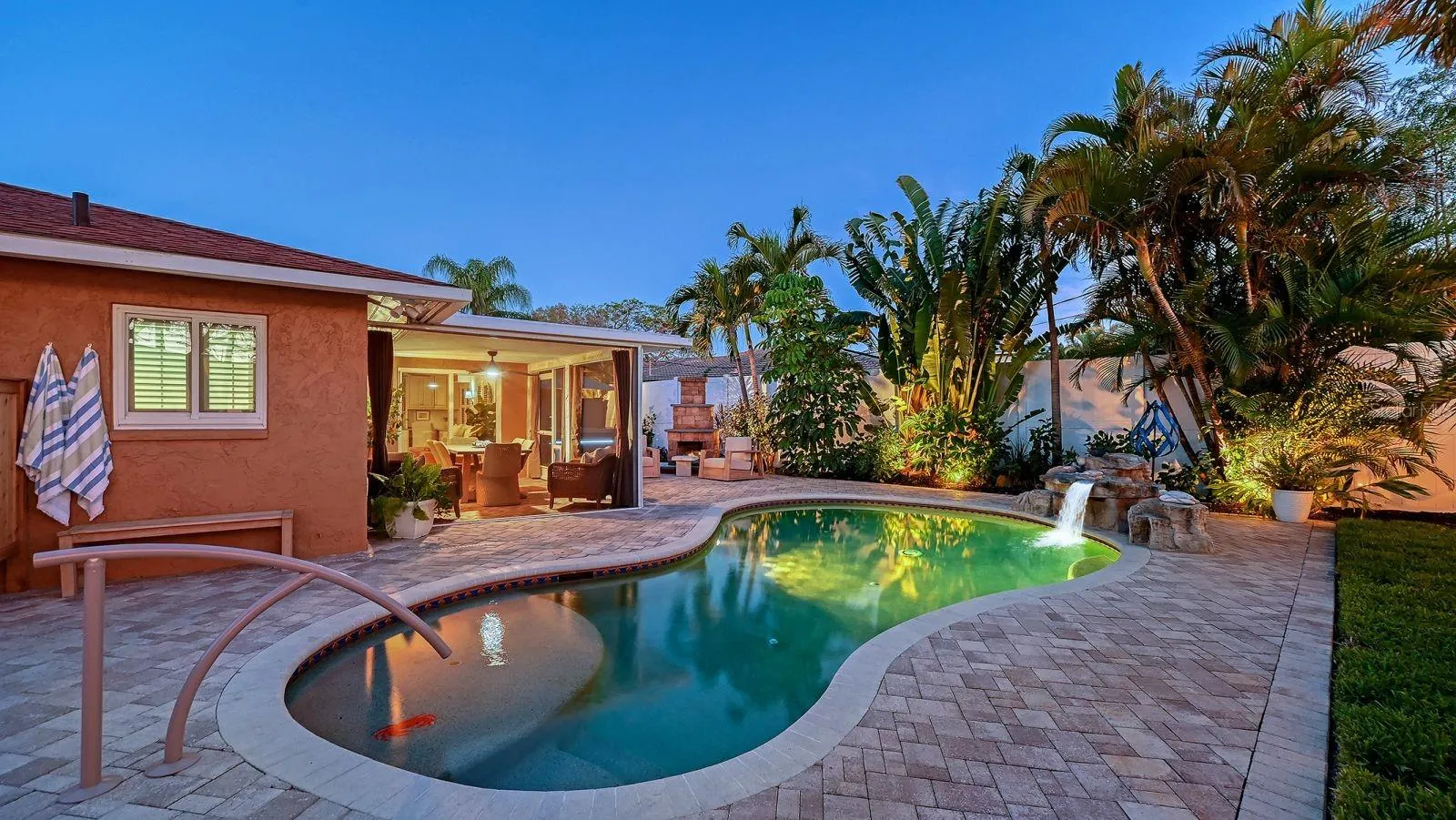 Just steps from the stunning Sarasota Bay, this impeccably appointed corner-lot sanctuary welcomes you into a world of peaceful elegance and resort-style sophistication. As you arrive via the graceful circular paver driveway, you are immediately greeted by the lush, professionally redesigned front gardens bursting with new palm trees, Japanese blueberry trees, bougainvillea, vibrant flowering shrubs, and striking landscape boulders — setting the tone for serene, high-end luxury that defines every inch of this home.