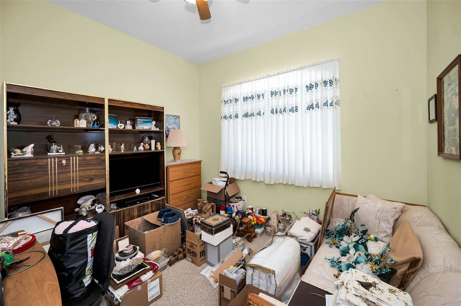 The heart of the home unfolds into a generous Great Room, highlighted by a magnificent tray ceiling and bathed in natural light. Sliding glass doors seamlessly connect the indoor living space to a beautifully enclosed lanai featuring plexiglass windows—creating a comfortable, all-season retreat for relaxing or entertaining while enjoying views of the lush, expansive backyard.