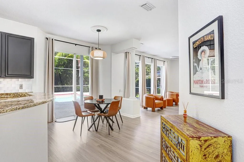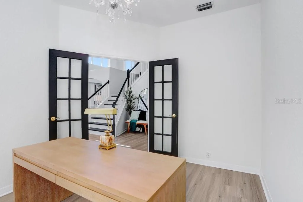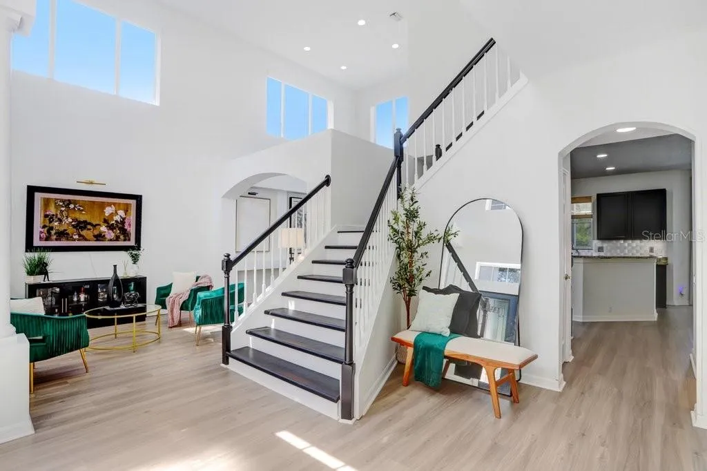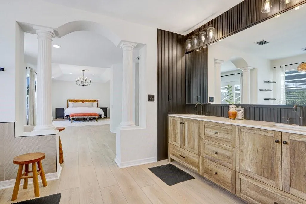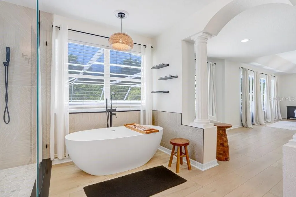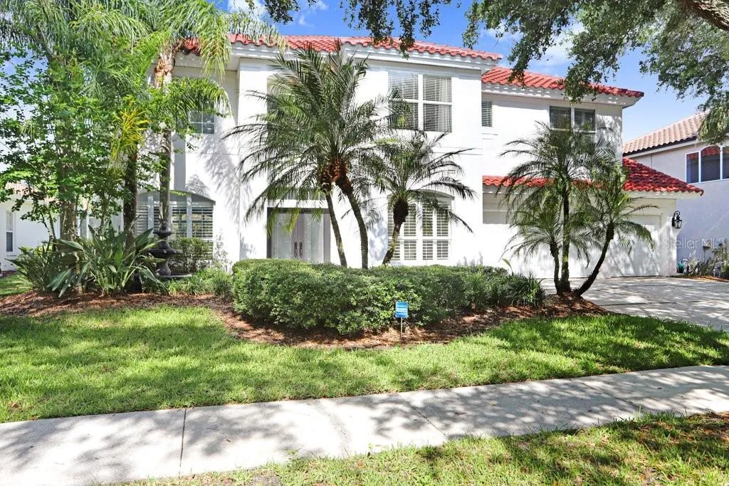 Welcome to this stunning tile barrel roof, two-story pool home located in the highly coveted, gated and 24/7 manned community of Hunter’s Green in the heart of New Tampa. This beautifully appointed residence features 4 bedrooms, 2 full baths, a private office, powder room, and showcases serene conservation views. Step inside to soaring double vaulted ceilings in the entryway and formal living spaces, highlighted by a striking modern chandelier and an abundance of natural light. Elegant plantation shutters and light wood-look luxury vinyl plank flooring add warmth and sophistication throughout. The dedicated office, complete with 10-panel French glass double doors, provides the perfect work-from-home retreat. The spacious kitchen is designed for both function and style, featuring an island, 42” dark wood cabinetry, granite countertops, and stainless steel appliances. A cozy dinette area with glass sliders opens seamlessly to the covered patio, pool, and spa—ideal for indoor-outdoor Florida living. Upstairs, a charming two-way staircase with decorative spindles leads to an expansive luxury primary suite. This private retreat boasts a beautifully remodeled spa-like bath with a freestanding tub, oversized frameless glass shower with upgraded rainfall showerhead, dual vanities with quartz counters, a sitting area, and a private balcony overlooking the tranquil surroundings. Three additional generously sized bedrooms share a well-appointed bath with dual sinks and a tub/shower combination. Hunter’s Green offers an unparalleled lifestyle, blending suburban comfort with natural beauty. Set among 43 lakes and 65 acres of protected wetlands, residents enjoy 23 distinct enclaves and an array of amenities including bike lanes, playgrounds, lighted tennis, basketball, volleyball, soccer and baseball fields, a jogging trail with a 15-station fitness circuit, and an off-leash dog park. Optional membership to Hunter’s Green Country Club provides access to the 18-hole Tom Fazio-designed golf course and a premier tennis and athletic center. Adjacent Flatwoods Nature Park features a scenic 7-mile loop for biking, hiking, and bird watching. All of this, just minutes from abundant shopping, dining, and conveniences right outside the community gates. Roof (2020), HVAC (2018 and 2021), Hotwater Tank (2025).
