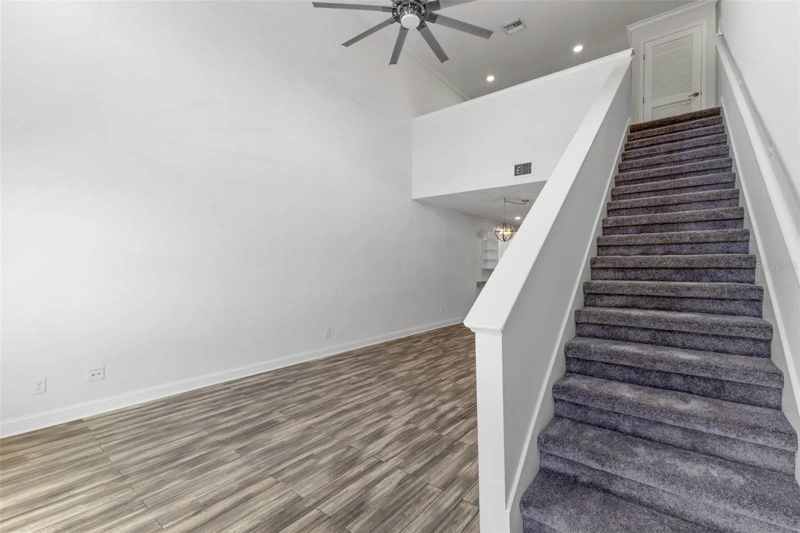 The home is finished with luxury vinyl flooring throughout the main areas, complemented by quartz countertops, soft-close cabinetry, and stainless steel appliances in the kitchen. Brand new carpet has just been installed, making the home move-in ready. A one-car garage and downstairs washer and dryer hookups add to the everyday ease of living.