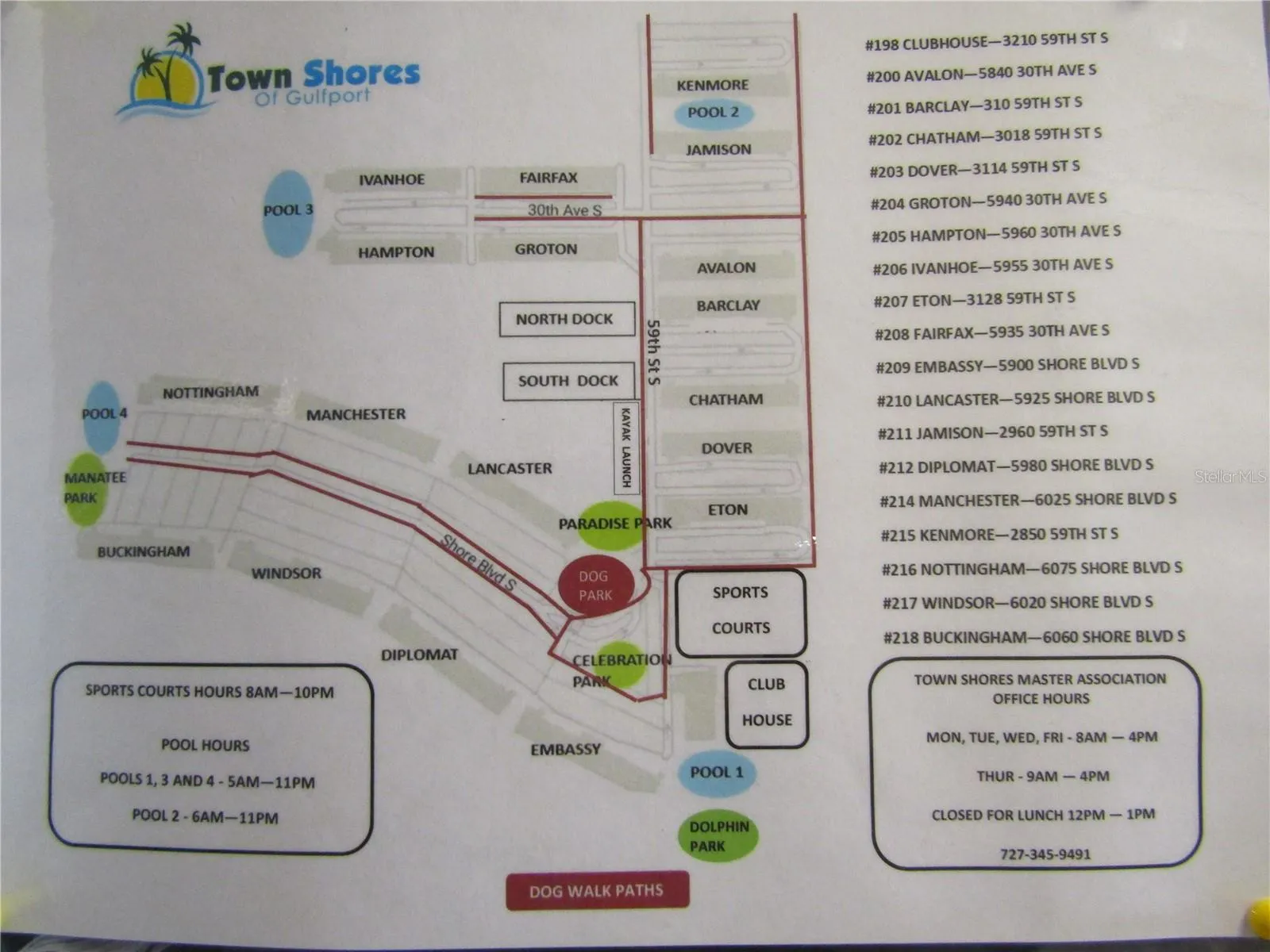 - 22nd Ave S west to left, south on 58th St. and follow to the entrance of Town Shores on right. Turn right, west into the community then 1st left, south into the community. Follow south past the round about and take first left into the EMBASSY building entrance then immediate right into the Diplomat parking lot to "visitor parking spaces and park. Diplomat is second building from the left, east of the Club House.