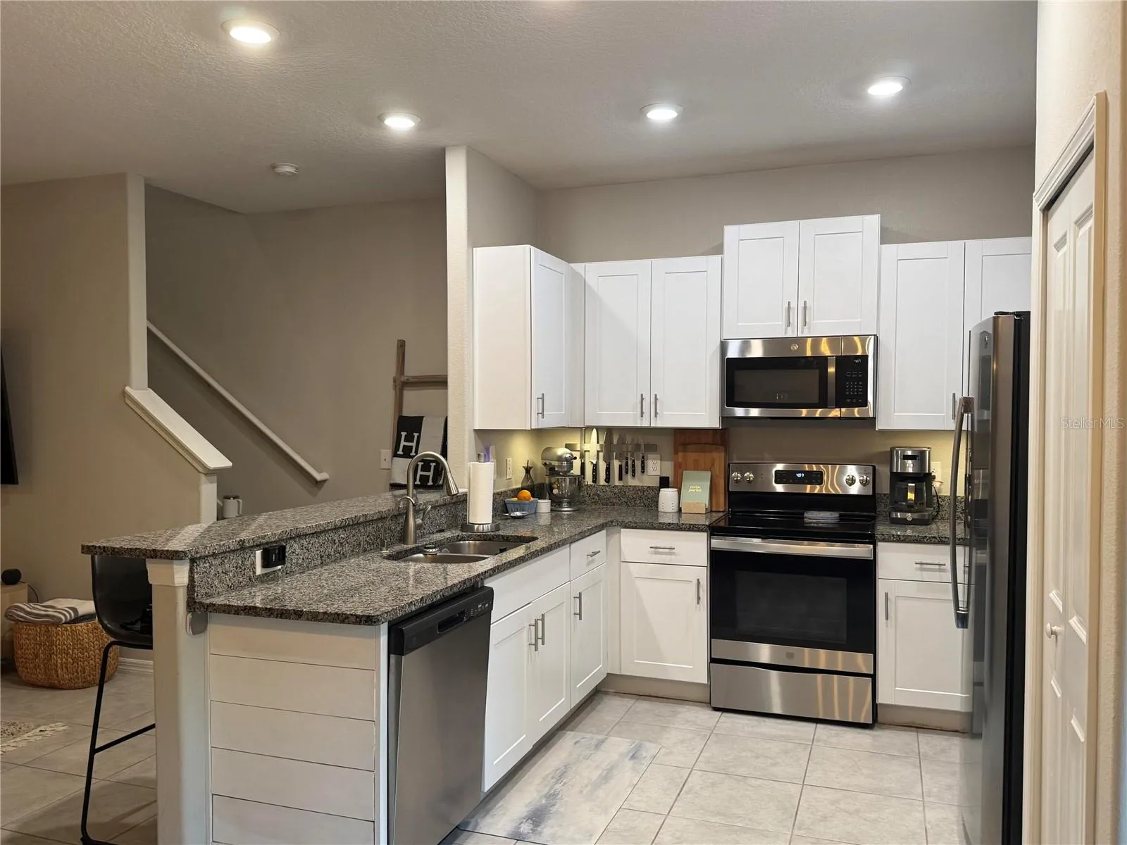 * Modern Kitchen: Light cabinetry, granite countertops, and a breakfast bar. Equipped with a full suite of GE stainless steel appliances.