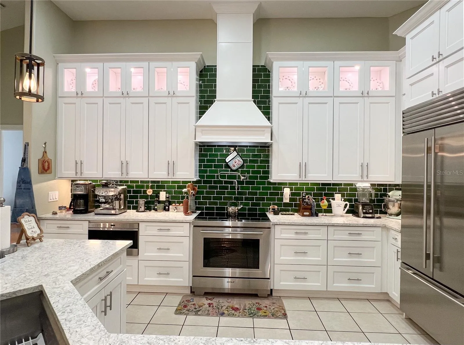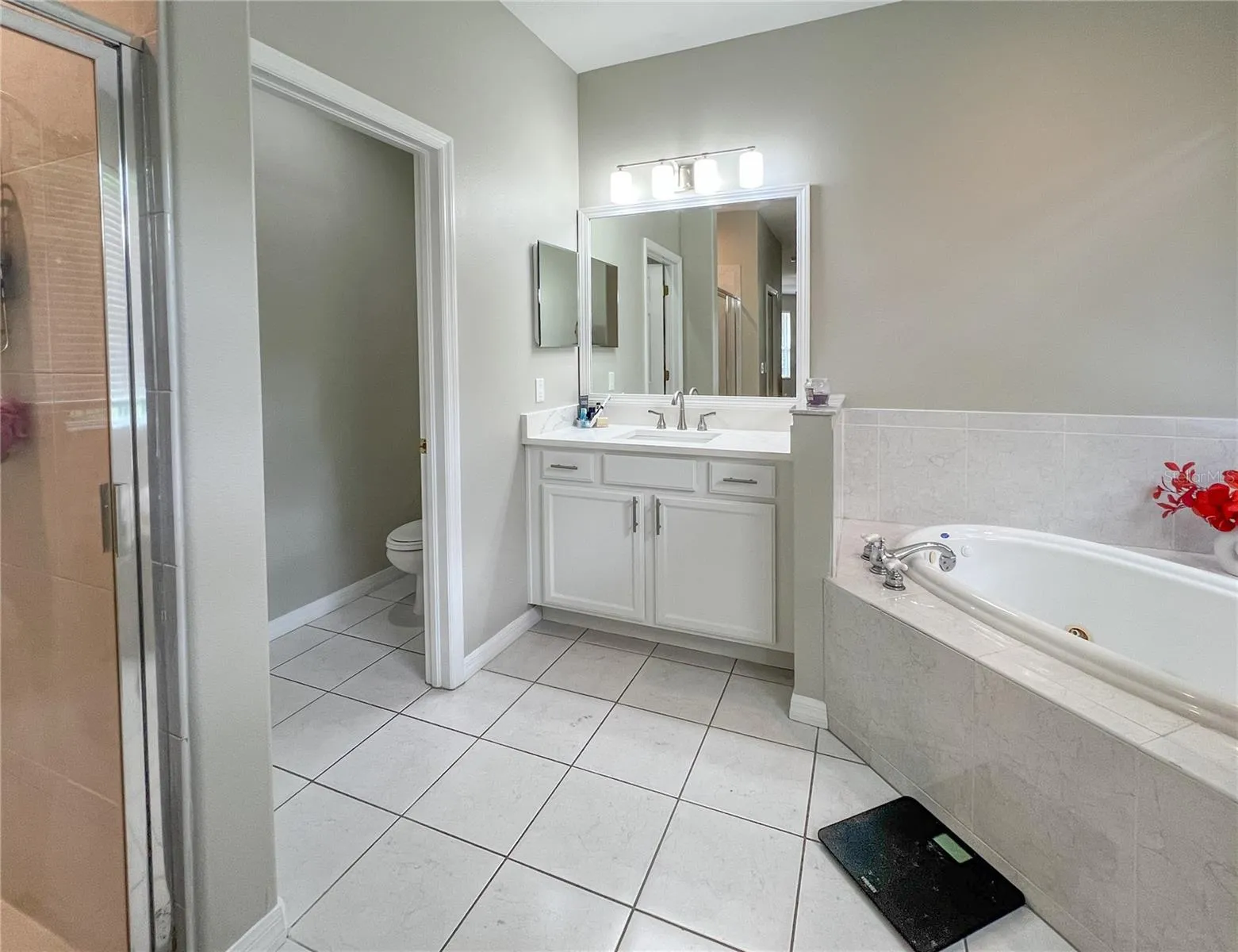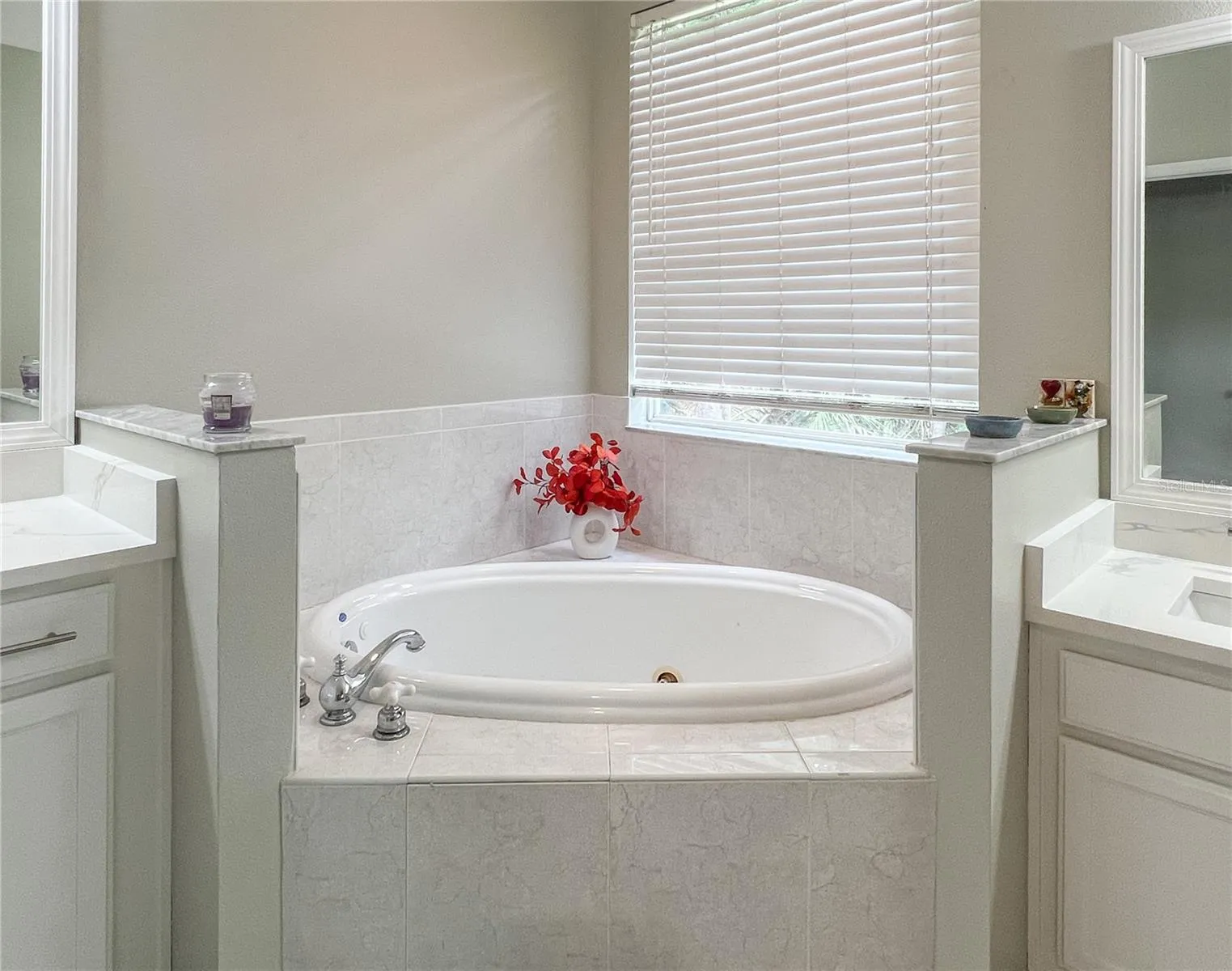 The oversized Owner’s Suite is split from the other bedrooms for maximum privacy. A jetted spa tub, separate shower, dual vanities with lavatories, and a private powder room give the Owner’s Spa/Bathroom the luxurious feel you would expect in a home of this caliber. Refreshed in recent weeks, finishes include quartz countertops, updated cabinet hardware, and upgraded lighting and plumbing fixtures.