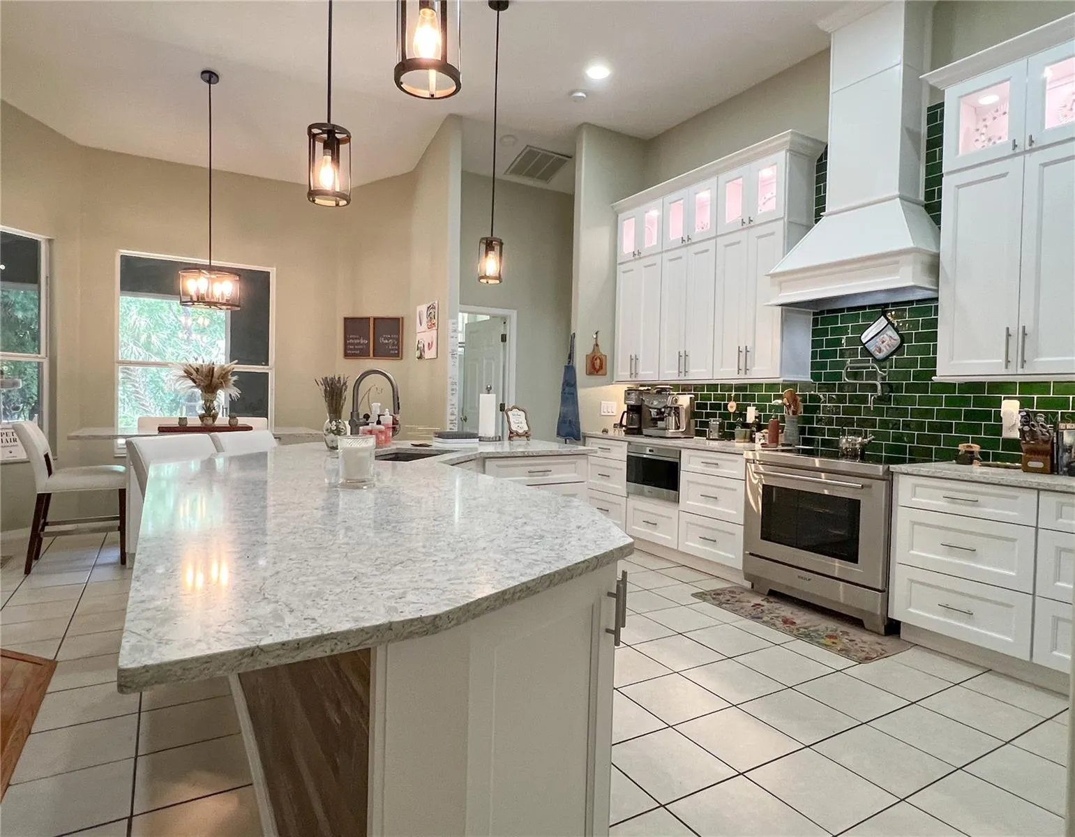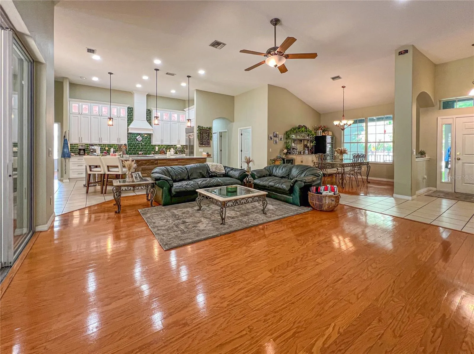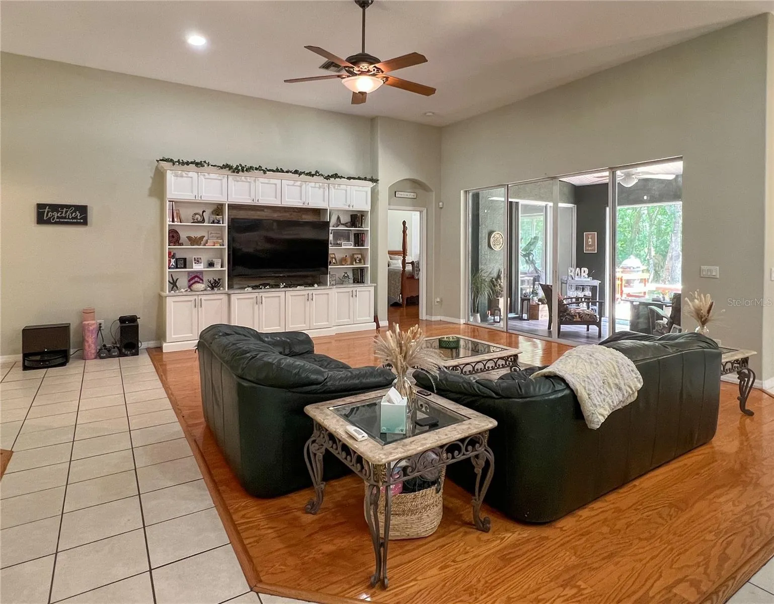 Remodeled in 2022, the Chef’s Kitchen offers all the fine appointments you would expect in an executive home: quartz countertops, custom cabinetry adorned with crown moulding, and a backsplash that adds a pop of color. High-end stainless steel appliances include a Wolf induction range, and a Wolf microwave drawer, Subzero double-door refrigerator, and a quiet Samsung dishwasher (2025). The designer-inspired Dinette space features a custom banquette-style island with a quartz countertop and seating for four. The breakfast bar defines one side of the Kitchen while connecting it seamlessly to the Living Room. The Living Room features gleaming wood floors along with custom, built-in shelves and cabinets.