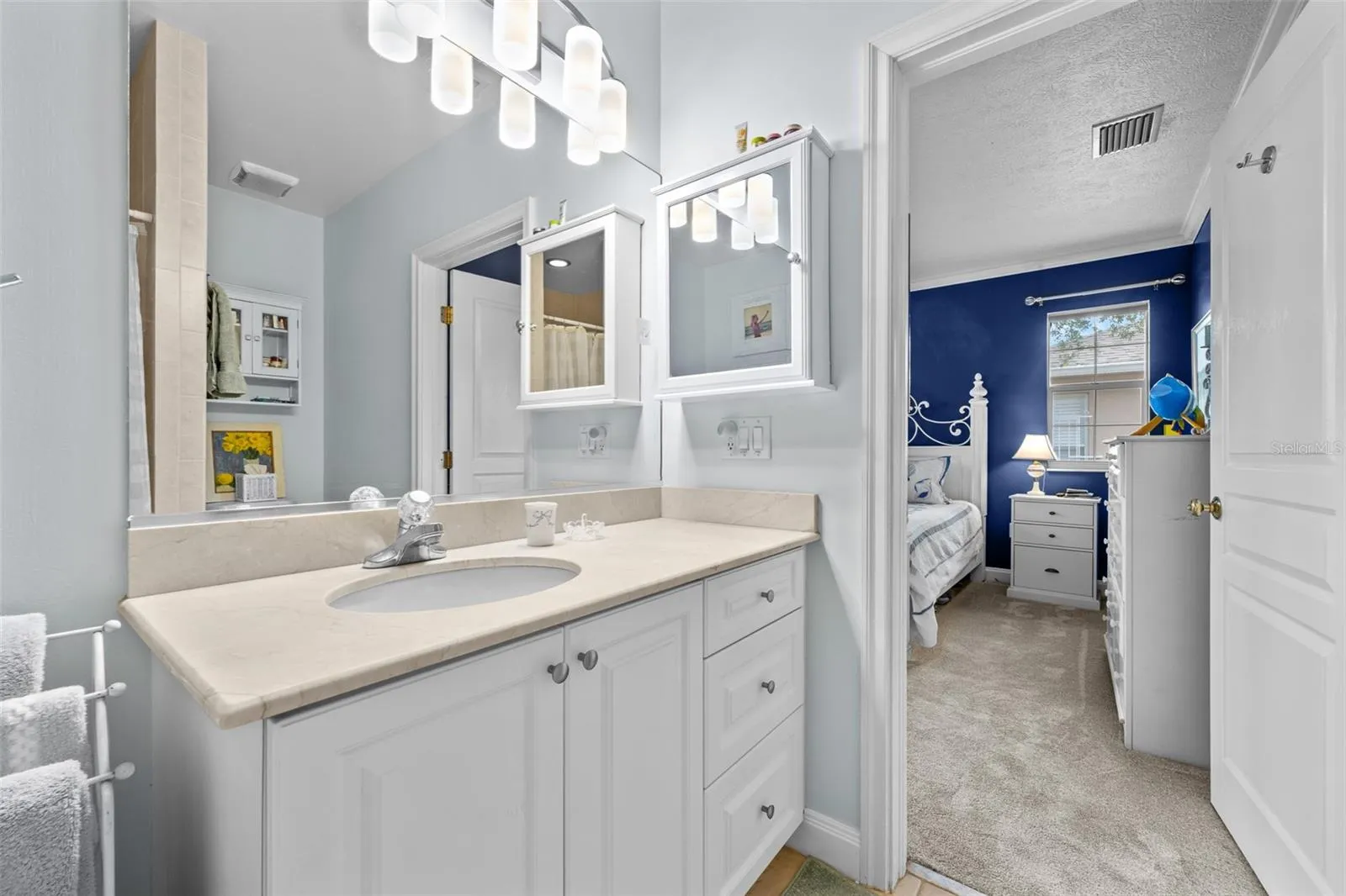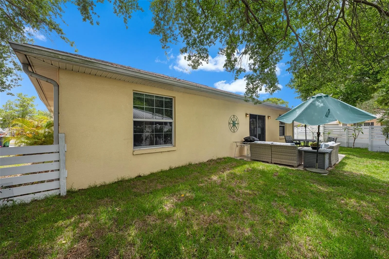 to the left and spacious living room to the right. There is a great utilization of interior space which is part of a split floor plan. On one side there is a hallway leading to two bedrooms, a full bathroom and a laundry room which opens to the double car garage. The other side features a spacious kitchen with hickory cabinets, quartz counters, stainless appliances and a good sized breakfast bar. This overlooks a large family room which opens to an ample primary suite with private bath featuring separate walk in shower and a jetted tub. The family room also opens to delightful patio and newly fenced as well as landscaped rear yard. All plus solid block construction, beautiful crown molding, and a roof which was installed in 2021.