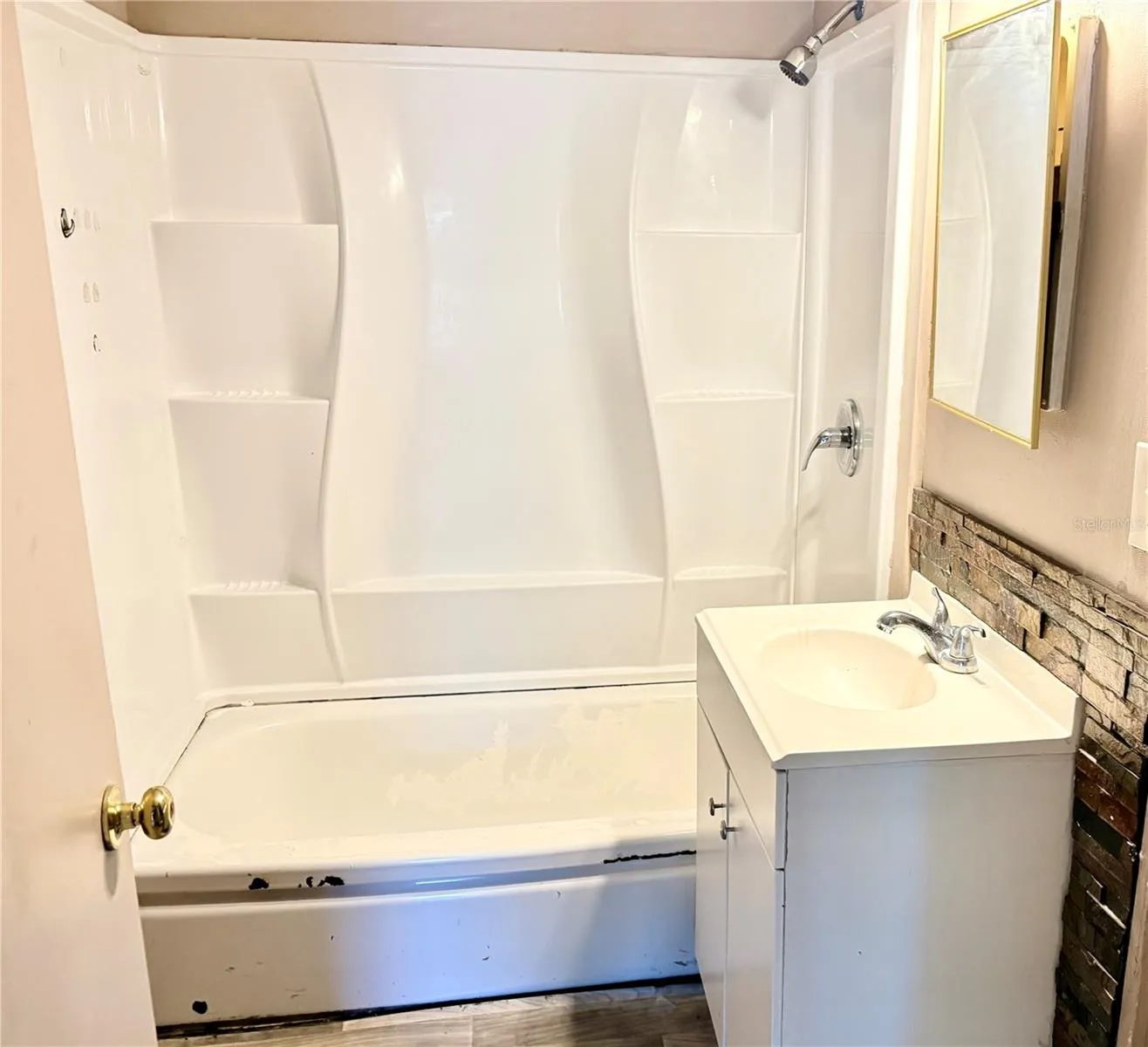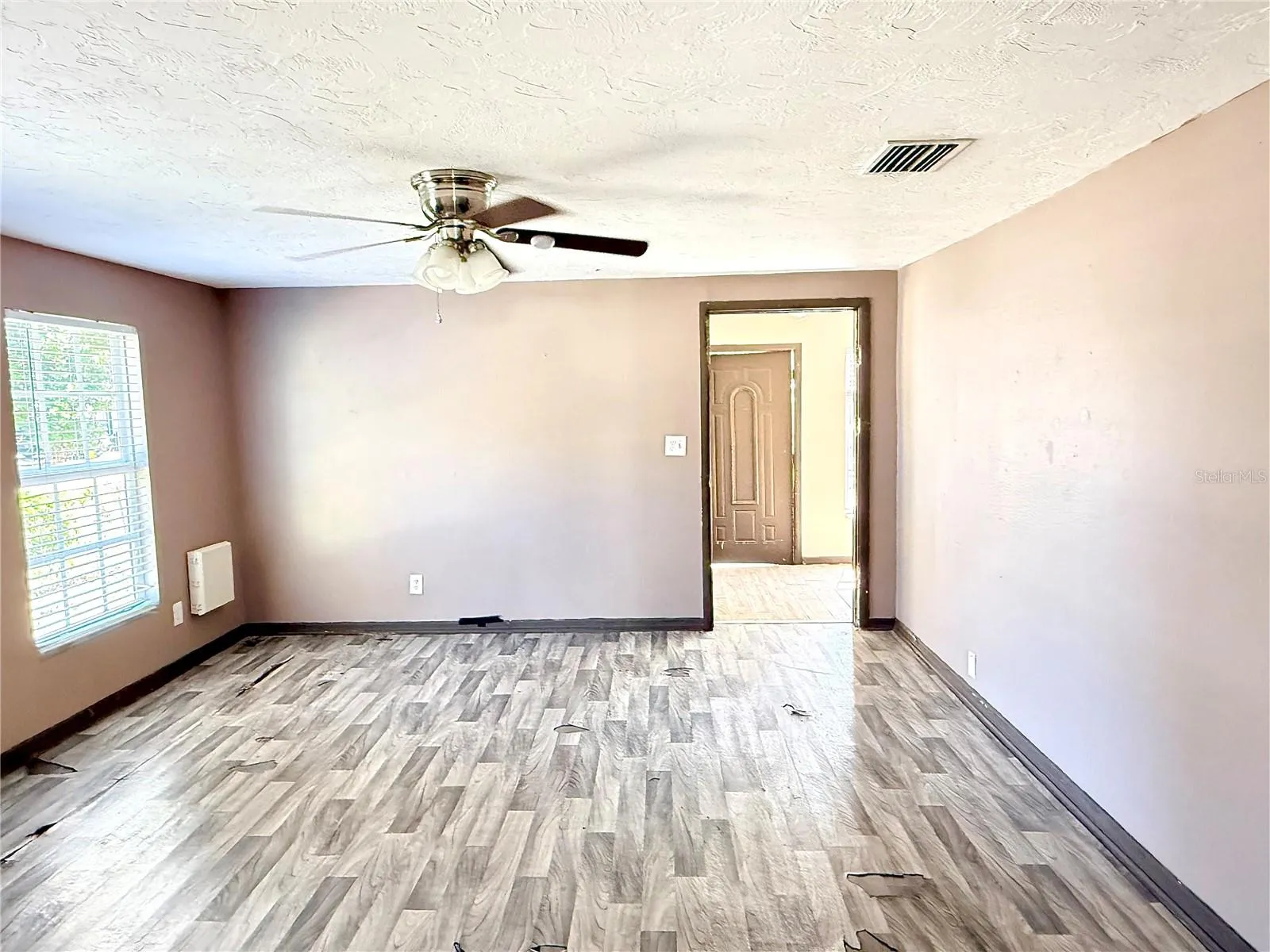 Inside, the home features a functional and open layout with a spacious kitchen offering abundant cabinetry and a comfortable dining area. Natural light fills the primary bedroom, while two additional bedrooms provide versatility, each complete with closet space. The full bathroom includes both a bathtub and shower for everyday ease. Laminate plank flooring runs throughout, with select areas offering an opportunity for light updates to truly elevate the space.
