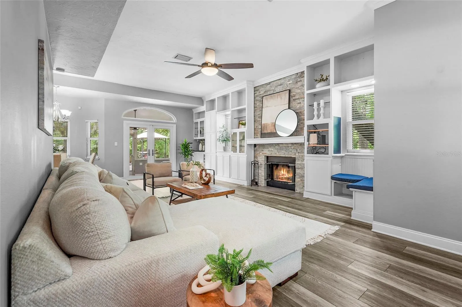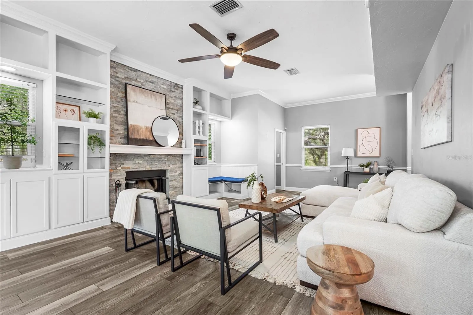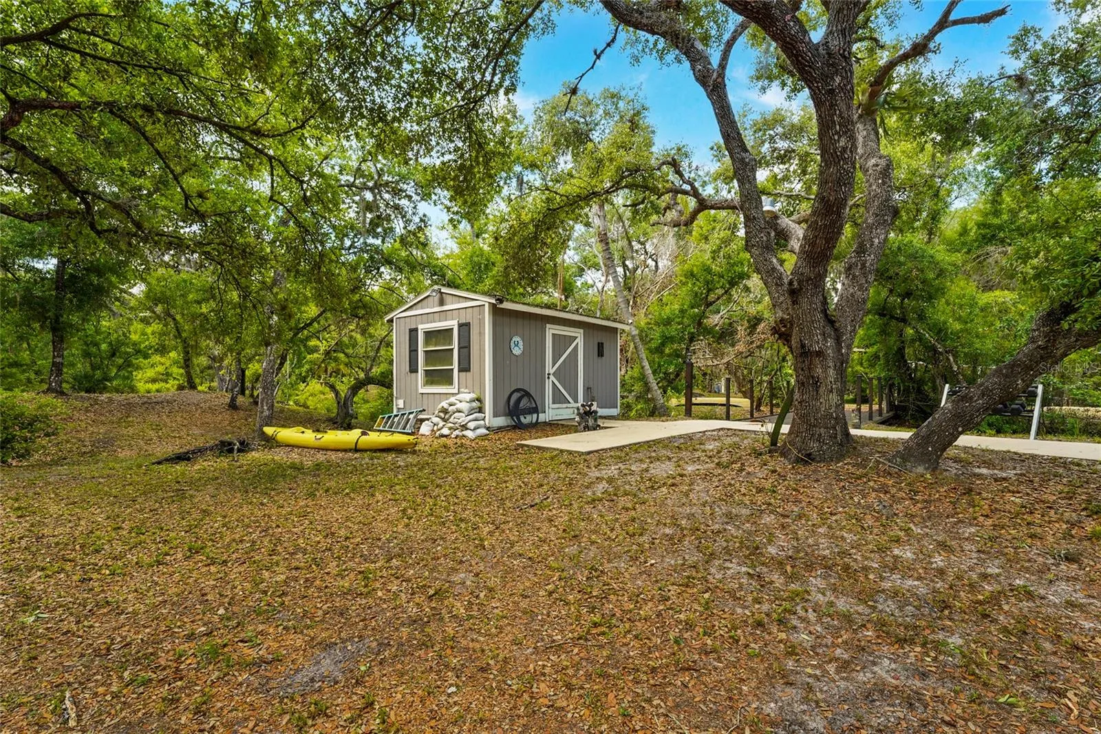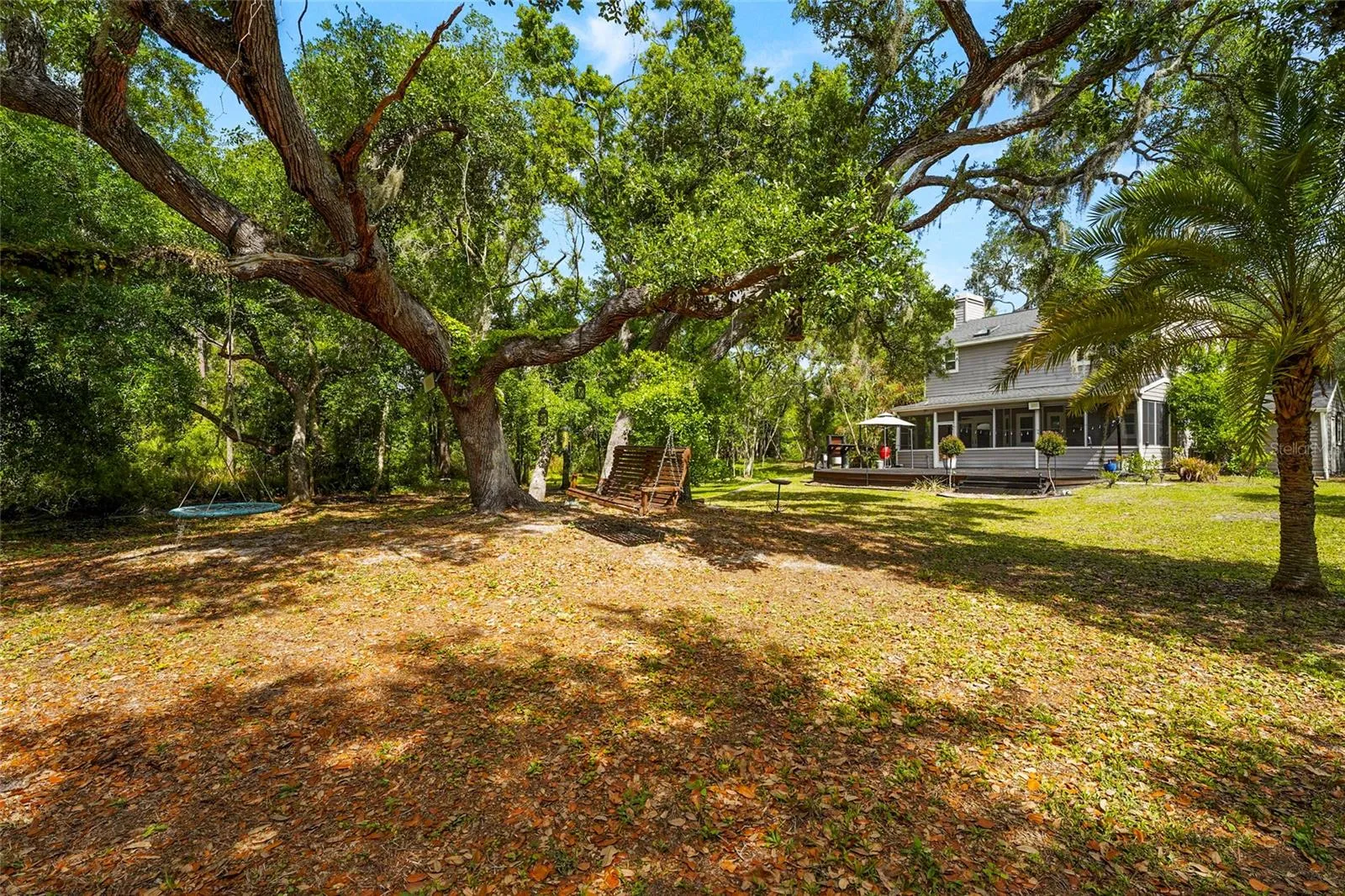 Welcome to one of Myakka’s hidden treasures! This 3-bedroom, 2.5-bathroom home, perfectly positioned on 2.23 acres, is surrounded by a picturesque Florida landscape – a rare opportunity to enjoy privacy, space, and convenience all in one place. The property has been thoughtfully renovated, blending both comfort and design. As you step through the screen-enclosed entryway, you’ll be delighted by durable vinyl plank flooring, crown molding, custom built-ins, upgraded lighting, and neutral tones. The kitchen is a showstopper, featuring gray shaker cabinetry, stainless steel Whirlpool appliances, sleek quartz countertops with a waterfall edge, under-cabinet lighting, and a beautiful glass tile backsplash. The family room is cozy, functional, and visually appealing, with custom built-in storage and shelving, as well as a stackstone fireplace. All of the spacious bedrooms are located on the upper level of the home. The primary suite is a relaxing retreat, featuring a luxurious en-suite with a double-sink vanity, a beautiful stone countertop, a stylish tile shower, and a generously sized walk-in closet equipped with built-in organization. Entertaining is effortless with the large deck that extends beyond the covered patio, creating a true backyard oasis filled with grand oak trees and endless potential. Multiple seating areas are in place for you to enjoy and connect with nature, along with a charming footbridge spanning the creek. In addition to the main home, there are three additional structures: two storage sheds and a versatile workshop with two climate-controlled rooms ready for customization. Upgrades include: Impact Windows (2019), Roof (2020), HVAC (2022), Septic System (2024), and Well and Pump (2025). Located just 15 minutes from all that Lakewood Ranch offers: shopping, dining, the Premier Sports Campus, Lakewood Ranch Hospital, and more. Don’t miss your chance to make this one yours!