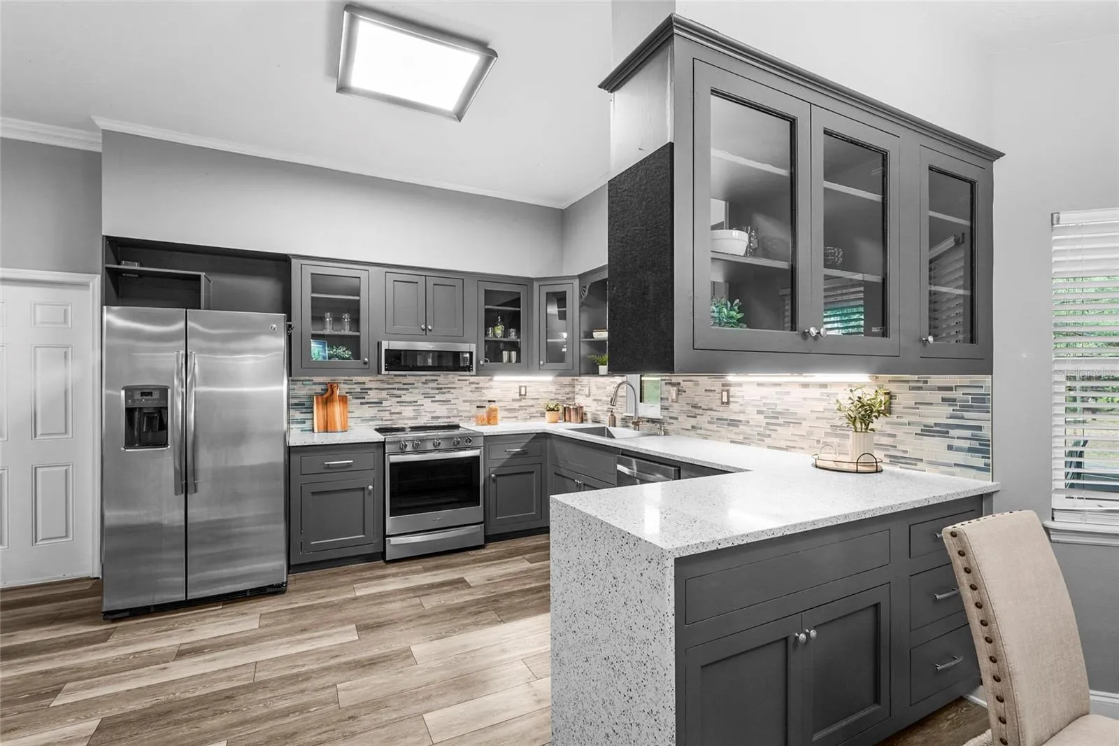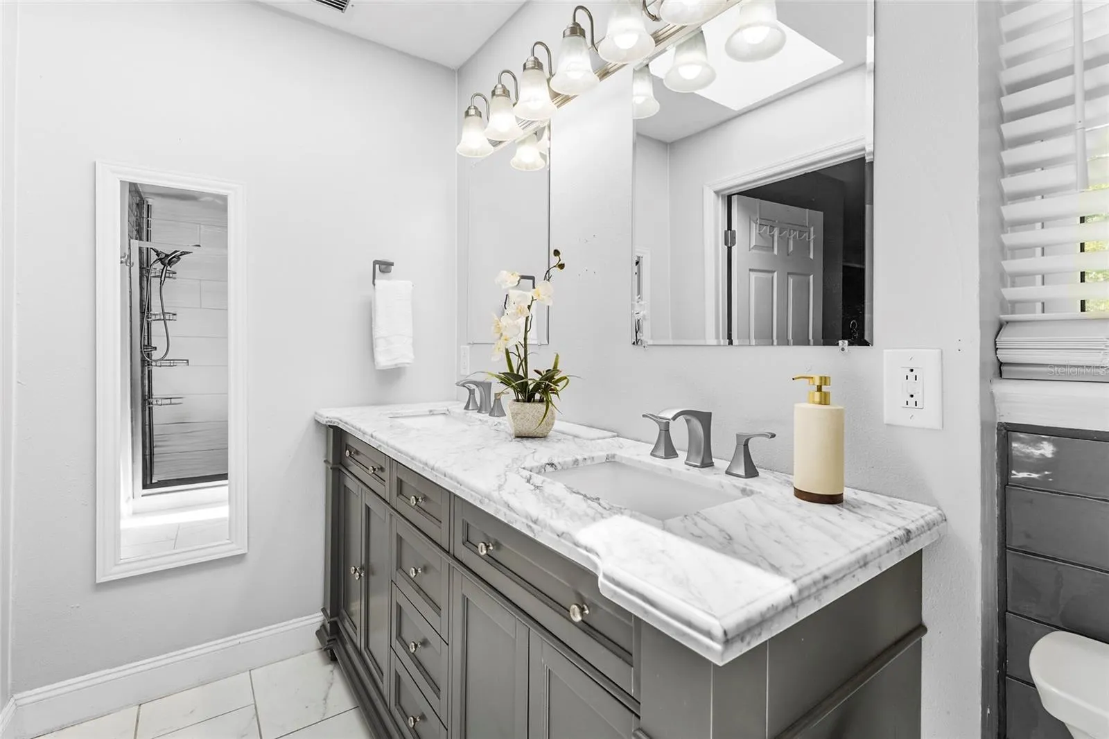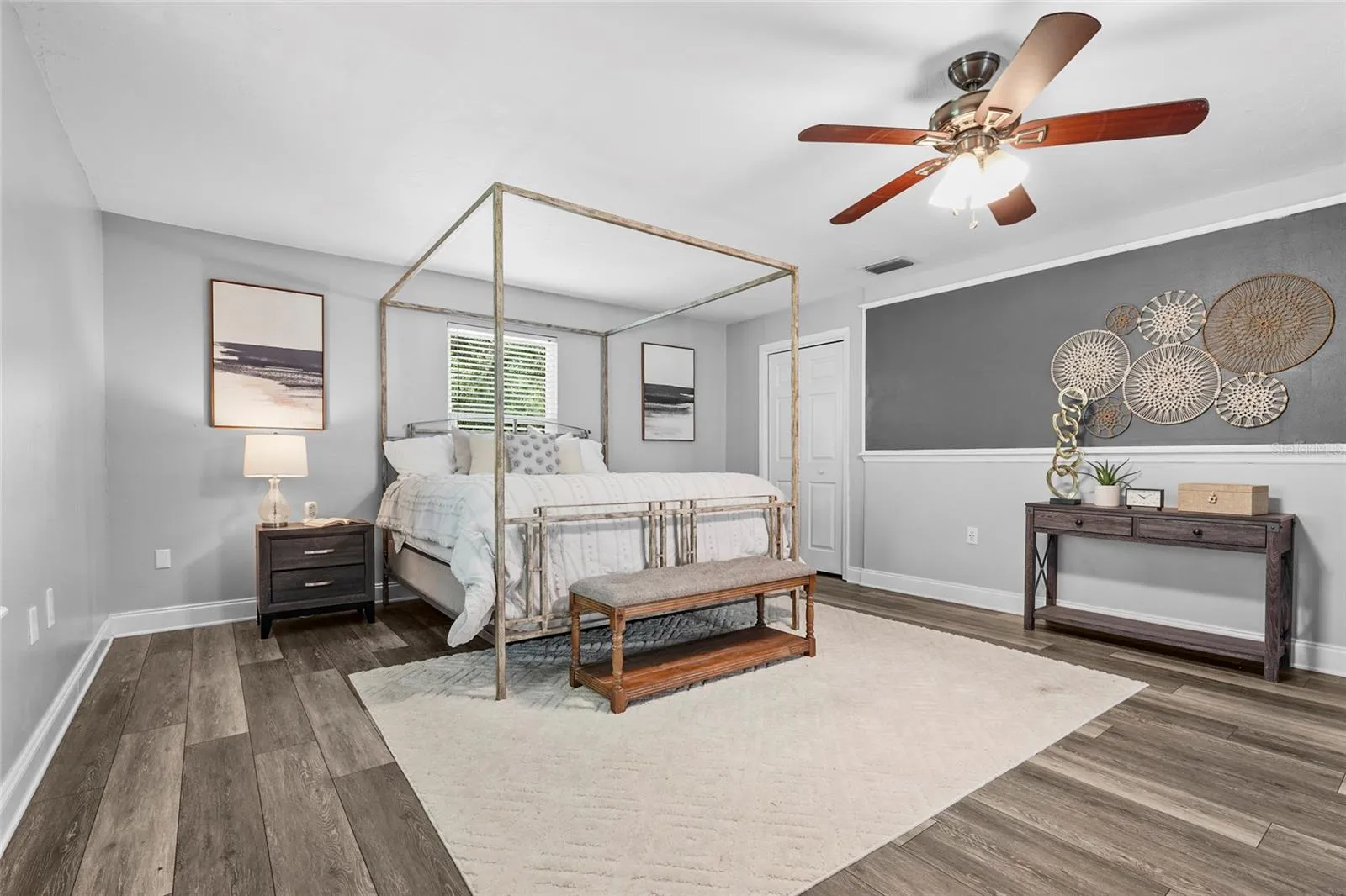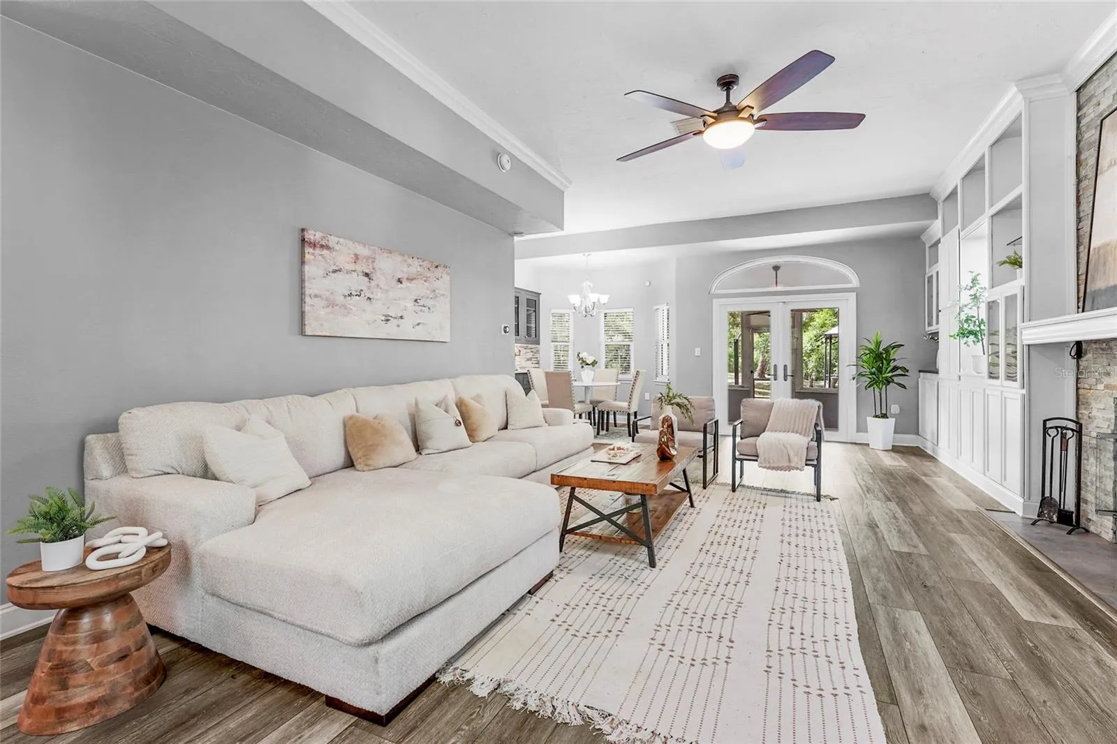 Welcome to one of Myakka’s hidden treasures! This 3-bedroom, 2.5-bathroom home, perfectly positioned on 2.23 acres, is surrounded by a picturesque Florida landscape – a rare opportunity to enjoy privacy, space, and convenience all in one place. The property has been thoughtfully renovated, blending both comfort and design. As you step through the screen-enclosed entryway, you’ll be delighted by durable vinyl plank flooring, crown molding, custom built-ins, upgraded lighting, and neutral tones. The kitchen is a showstopper, featuring gray shaker cabinetry, stainless steel Whirlpool appliances, sleek quartz countertops with a waterfall edge, under-cabinet lighting, and a beautiful glass tile backsplash. The family room is cozy, functional, and visually appealing, with custom built-in storage and shelving, as well as a stackstone fireplace. All of the spacious bedrooms are located on the upper level of the home. The primary suite is a relaxing retreat, featuring a luxurious en-suite with a double-sink vanity, a beautiful stone countertop, a stylish tile shower, and a generously sized walk-in closet equipped with built-in organization. Entertaining is effortless with the large deck that extends beyond the covered patio, creating a true backyard oasis filled with grand oak trees and endless potential. Multiple seating areas are in place for you to enjoy and connect with nature, along with a charming footbridge spanning the creek. In addition to the main home, there are three additional structures: two storage sheds and a versatile workshop with two climate-controlled rooms ready for customization. Upgrades include: Impact Windows (2019), Roof (2020), HVAC (2022), Septic System (2024), and Well and Pump (2025). Located just 15 minutes from all that Lakewood Ranch offers: shopping, dining, the Premier Sports Campus, Lakewood Ranch Hospital, and more. Don’t miss your chance to make this one yours!