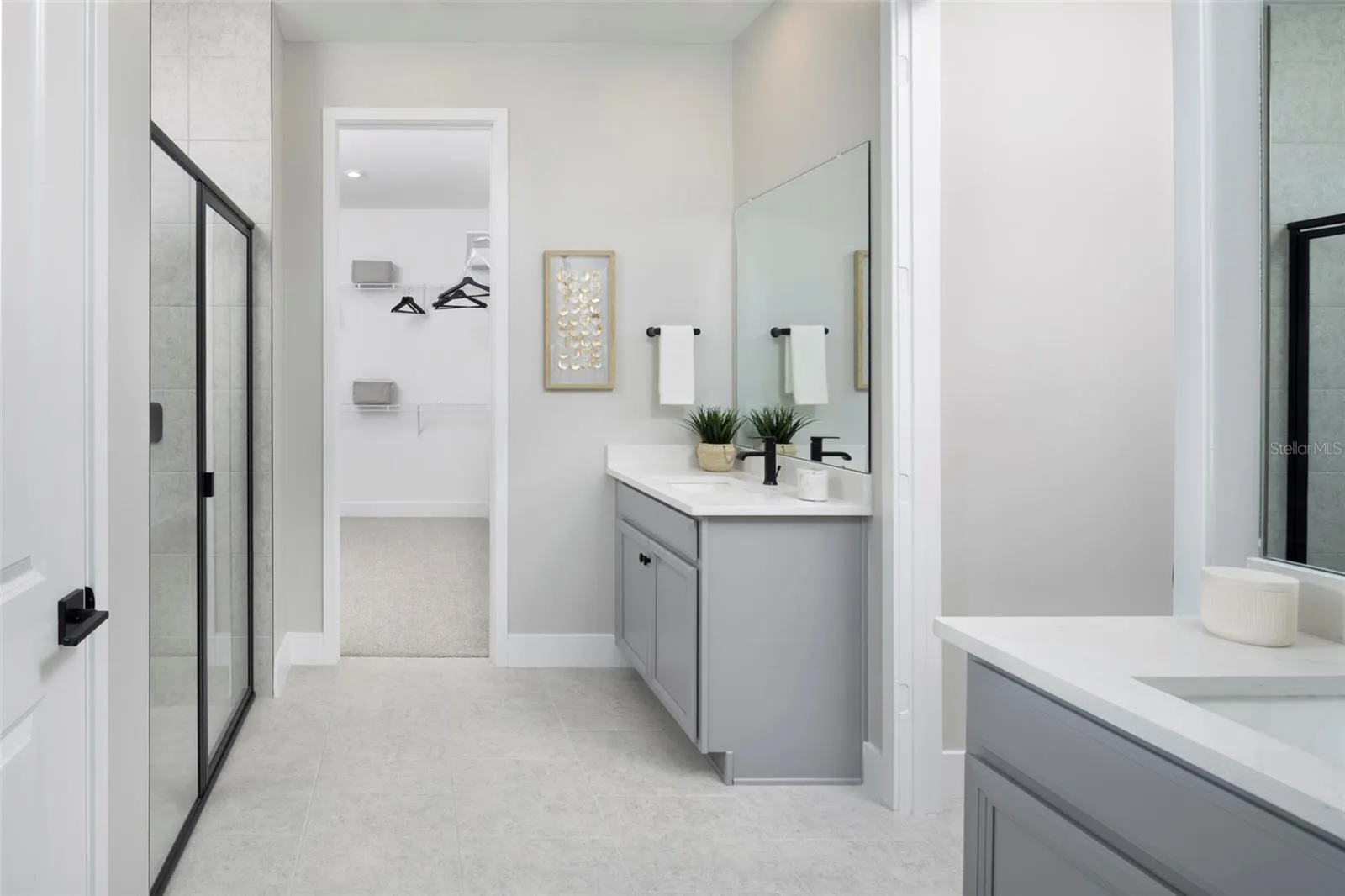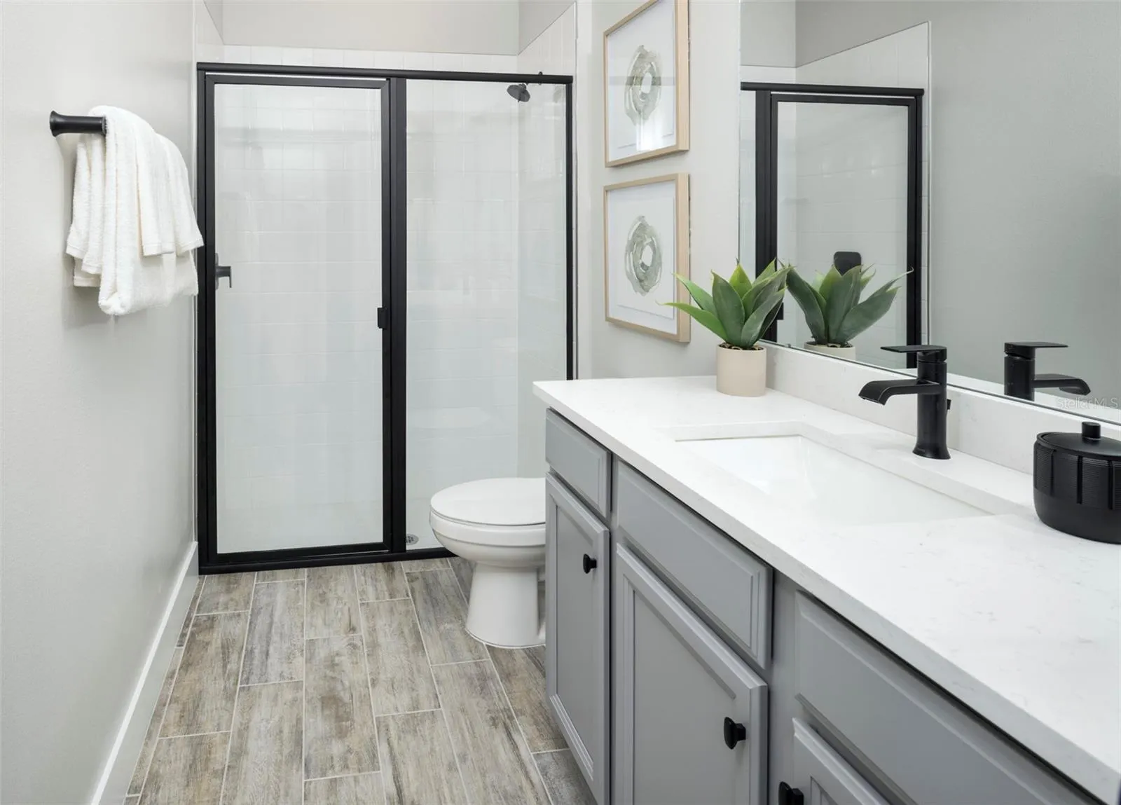 All bedrooms are located on one side of the home, with the flex room positioned between the two for added privacy. The owner’s suite is a tranquil retreat, complete with a luxurious en suite featuring split vanities, a glass-enclosed shower with a high-set privacy window, a private water closet, and a large walk-in closet. Bedroom two, situated at the front of the home, has easy access to the full hallway bathroom, making it ideal for guests or family. A convenient powder room is located off the foyer, offering an additional level of privacy and function.