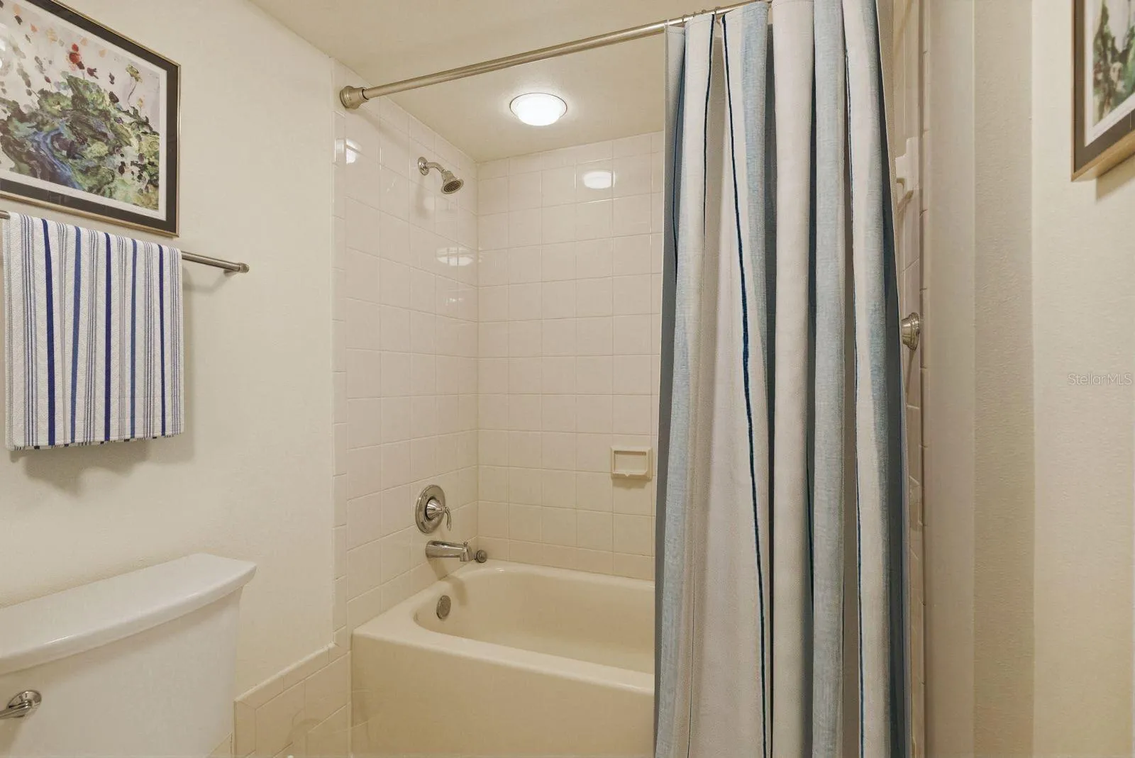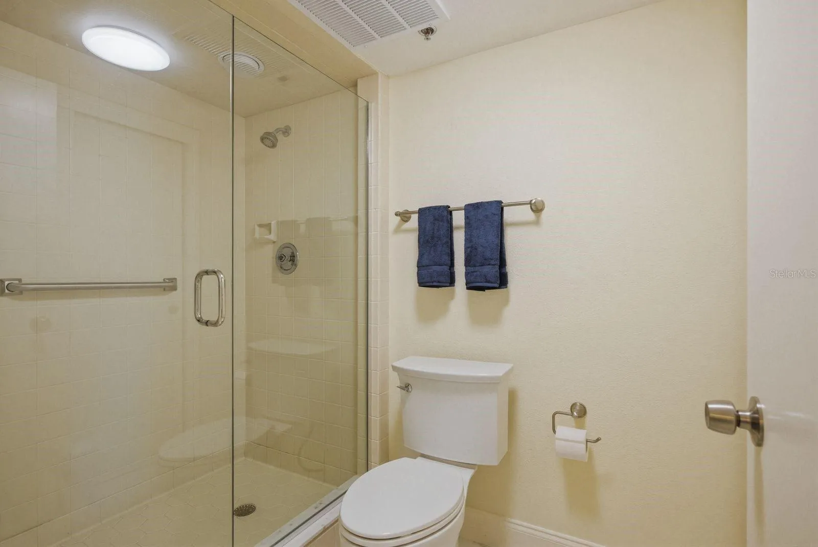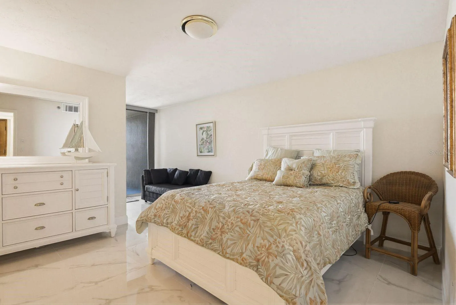 The generous primary bedroom is a true retreat, complete with a private updated bathroom, quartz counters, a large walk-in closet, and a private balcony offering stunning water views. The guest bedroom is equally impressive, boasting its own balcony with water views and an updated bathroom with quartz countertops.