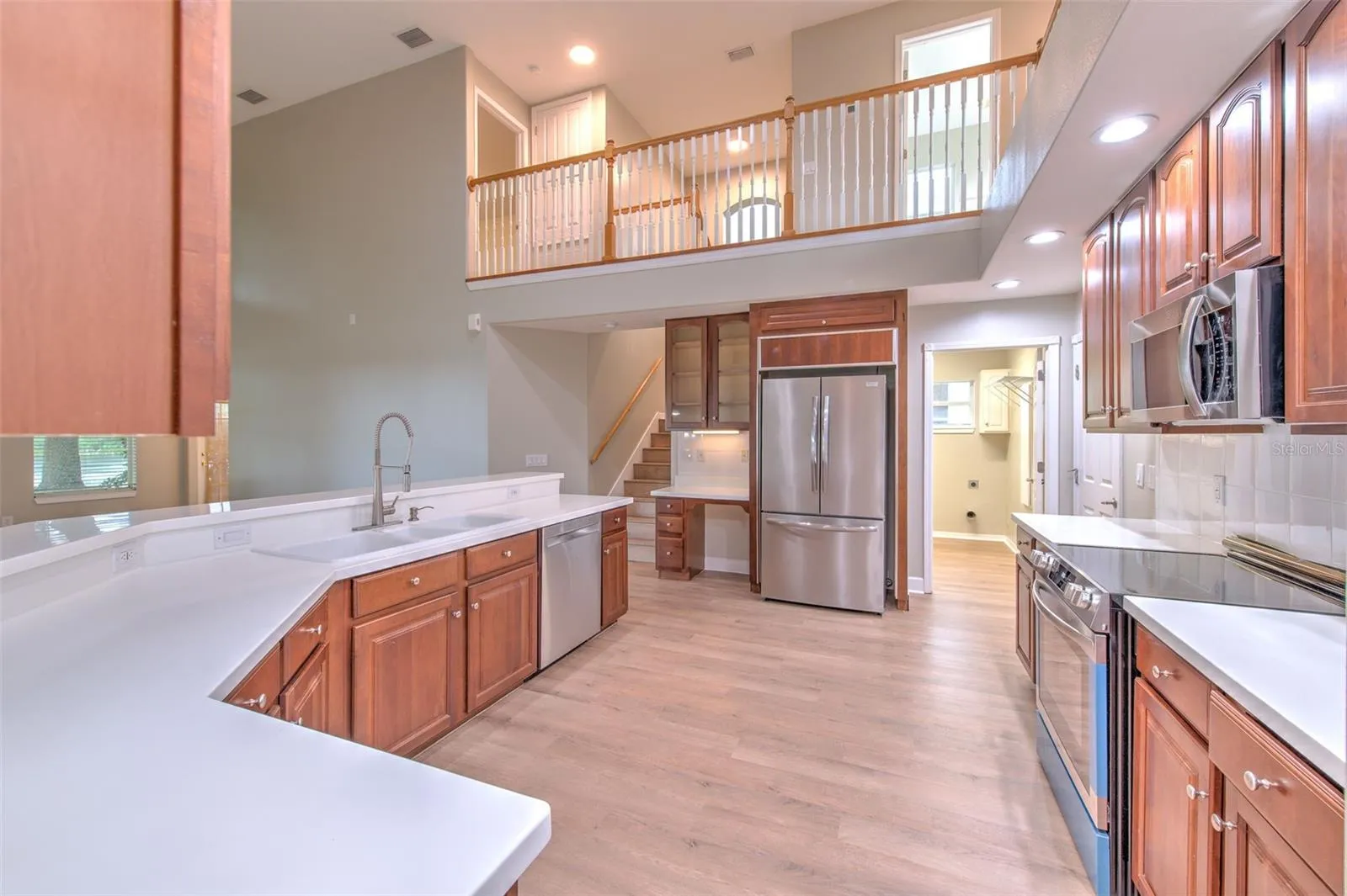 Beautiful 5 bedroom, 3 bath, 3 car garage, LAKE VIEW home in the GATED community of Lake Talia. A well-maintained neighborhood in the perfect location, it’s ready for you to call it home. Situated on an almost quarter-acre, 80 foot wide lot, you’ll enter to a lovely living room / dining room combination with sliders to the COVERED & SCREENED PATIO and AWESOME VIEW OF THE LAKE. The whole home has been UPDATED with BEAUTIFUL LUXURY VINYL PLANK FLOORING & NEW EXTERIOR PAINT! Follow the OPEN FLOOR PLAN to the kitchen with NEW STAINLESS STEEL APPLIANCES and family room with amazing two-story ceilings and tons of natural light! (More lake view here!) This 4-WAY SPLIT FLOOR PLAN really gives everyone their own space. The already spacious master bedroom is located on the ground floor on left side of the house and adds an extra sitting room with lake view, perfect for relaxing (or home office if preferred). The en suite master bathroom with dual, split vanities, garden tub, NEW FRAMELESS GLASS SHOWER, along with 2 WALK-IN CLOSETS complete this primary retreat. Another bedroom is also located on the ground floor with a full bathroom just off of it, great for a guest room. Three LARGE SECONDARY BEDROOMS with WALK-IN CLOSETS are located upstairs with a cute little loft area that overlooks the family room and kitchen. It even has a built-in desk for studying, reading, or organizing bills. Upstairs bathroom has DUAL VANITY & shower / tub combo. Large, downstairs laundry room has utility sink and a GREAT STORAGE CLOSET under the stairs for your extra stuff. 3 car garage and wide driveway allow for extra vehicles and really complete this fabulous home. Lake Talia has a park & playground / picnic area / full court basketball, not to mention great sidewalks / paths / benches along water views. READY FOR A QUICK MOVE-IN! Call today for your private showing!