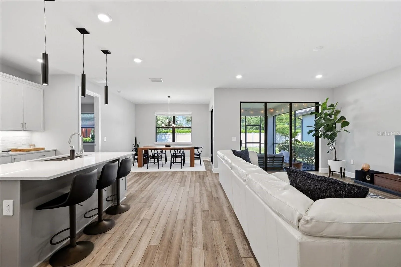 At the heart of the home, a crisp white kitchen feels both timeless and current, appointed with quartz countertops, KitchenAid appliances, 42-inch cabinetry, a statement hood, and an expansive island designed for gathering as much as everyday living. Just beyond, a dedicated dining space captures peaceful views of the private backyard, where mature trees provide a lush, tranquil backdrop.