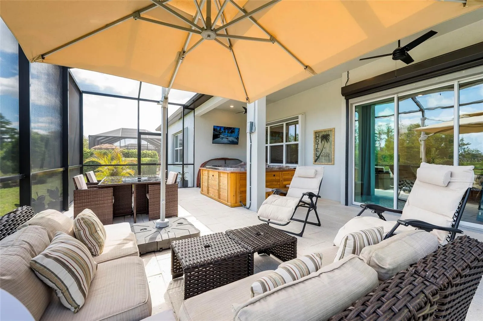 Step through triple sliders to a 600 SF screened lanai with Ivory Shellock “cool-touch” pavers, a 6-person spa, and conservation views. 3-car garage with epoxy floors, Gladiator racks, and a whole house NuvoH2O water treatment system. Hurricane-ready with accordion shutters and motorized screens. Enjoy resort amenities: 19k SF clubhouse, heated pools, pickleball, and a full-time lifestyle director. Welcome home!