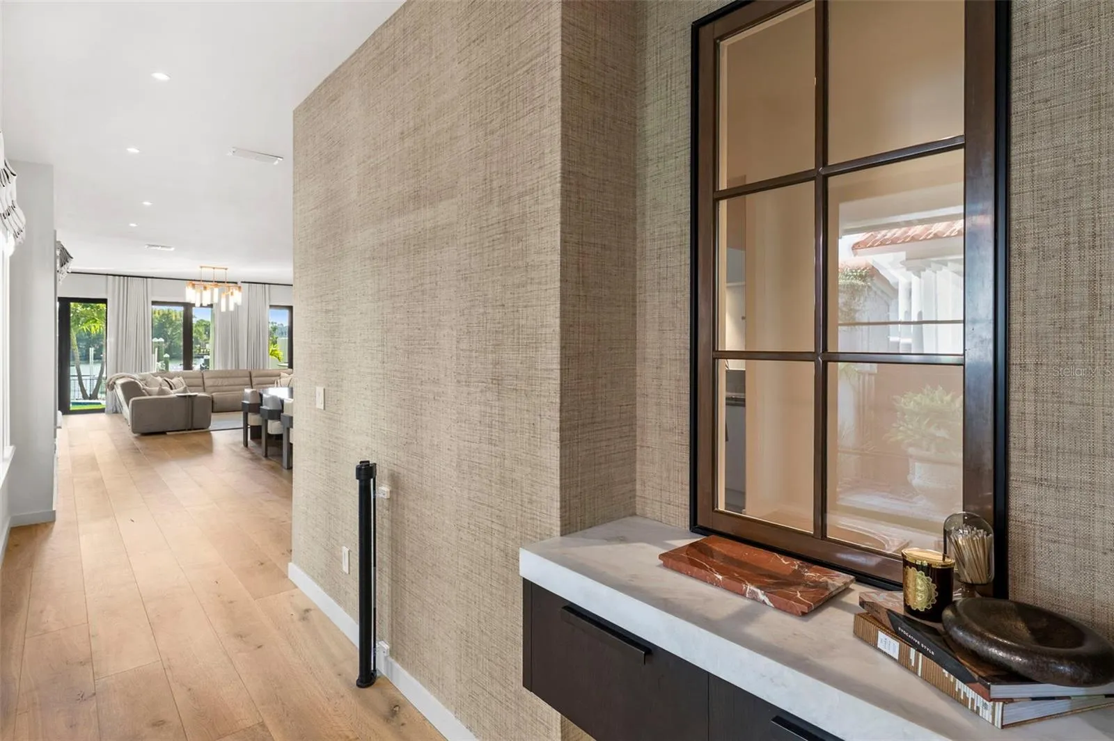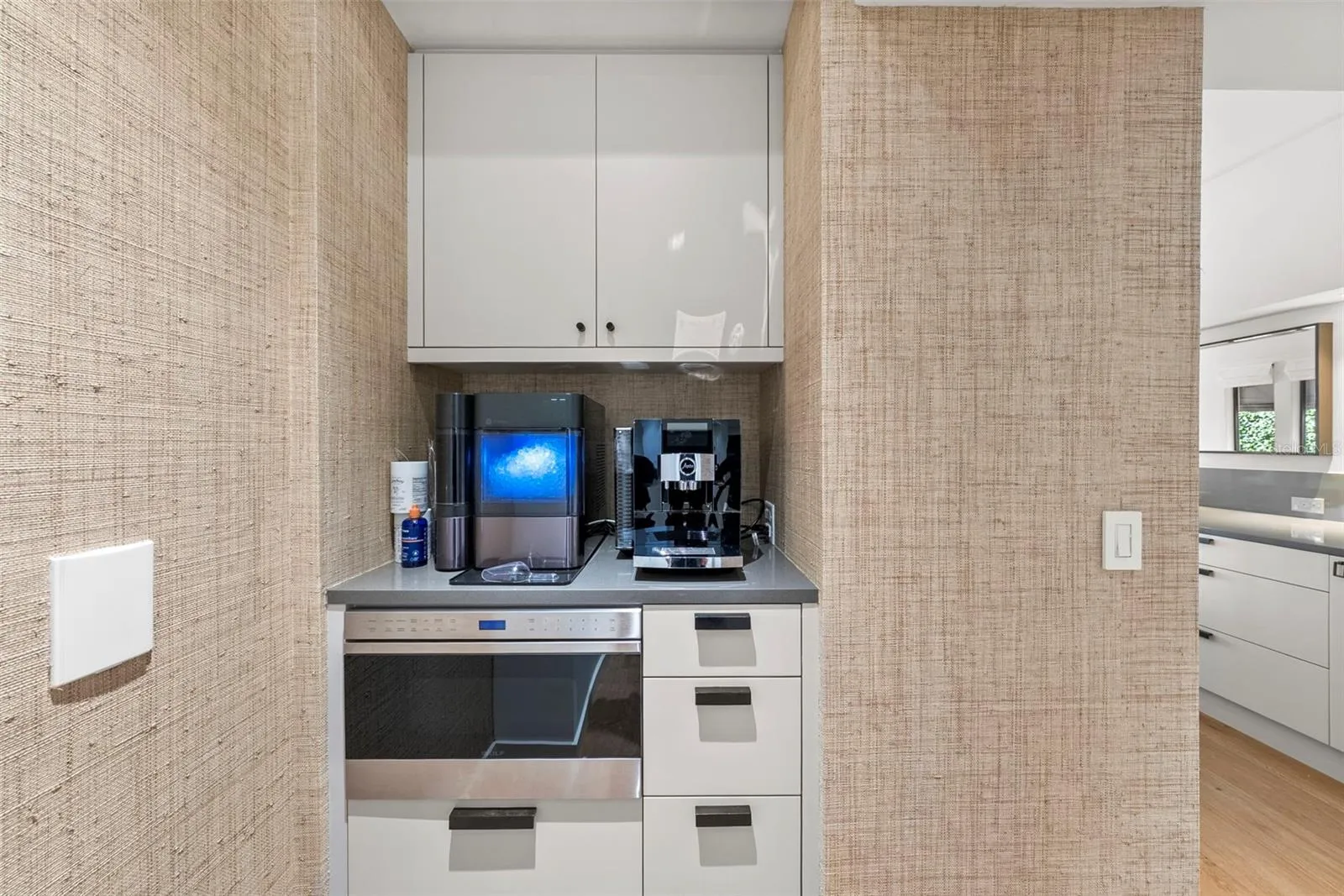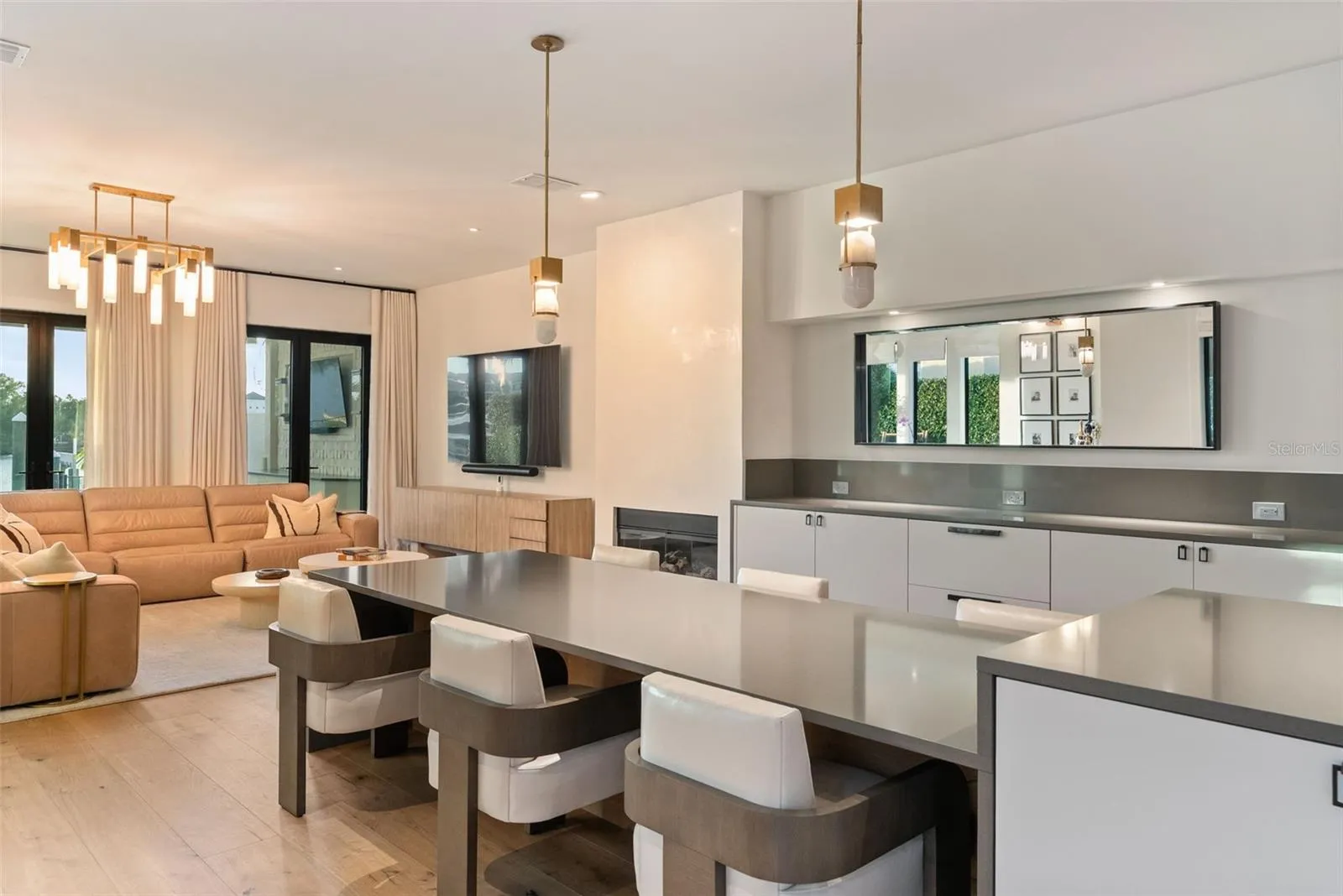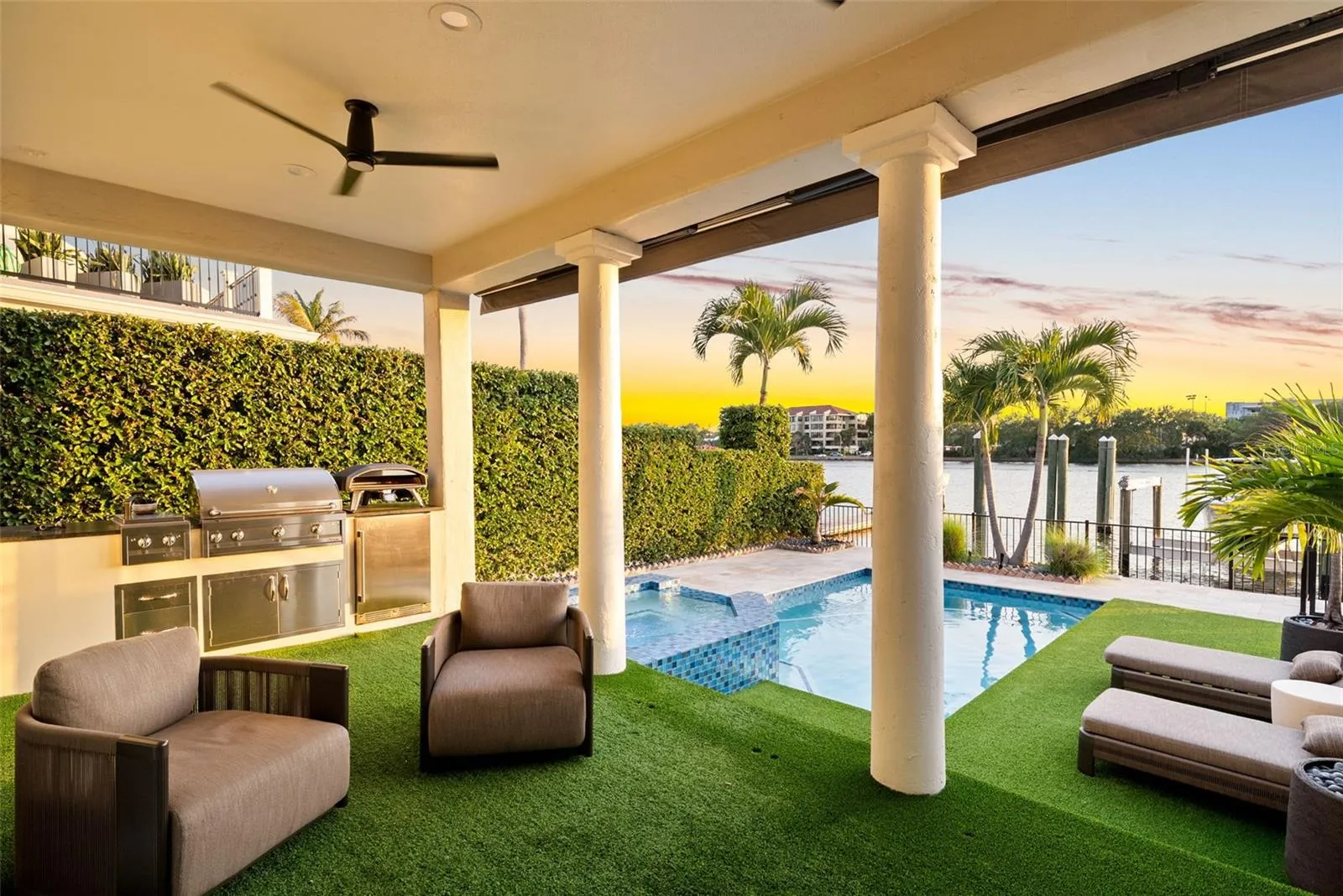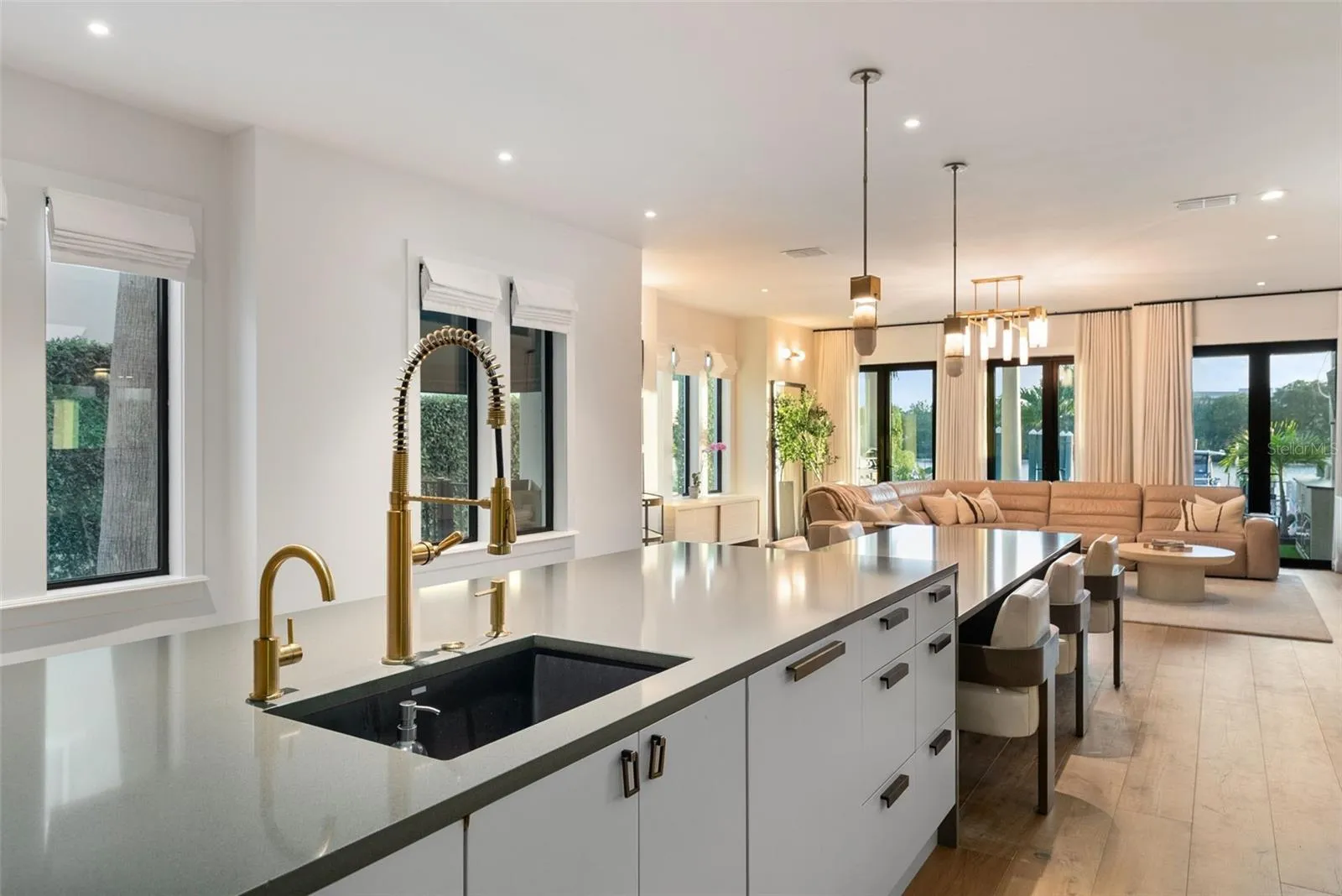 and Sub-Zero appliances, oversized drawer storage, walk-in pantry, coffee bar, and spacious dining area. Step outside to a waterfront paradise complete with built-in Wolf outdoor kitchen,