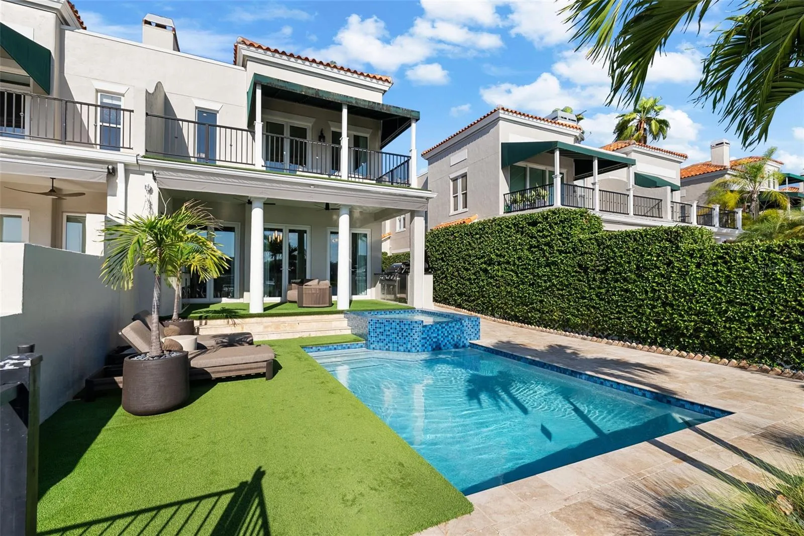 featuring a private pool, spa, covered lanai with sunshade, second-floor balcony, and exceptional privacy within a 24-hour guarded gated community. Thoughtfully reimagined interior