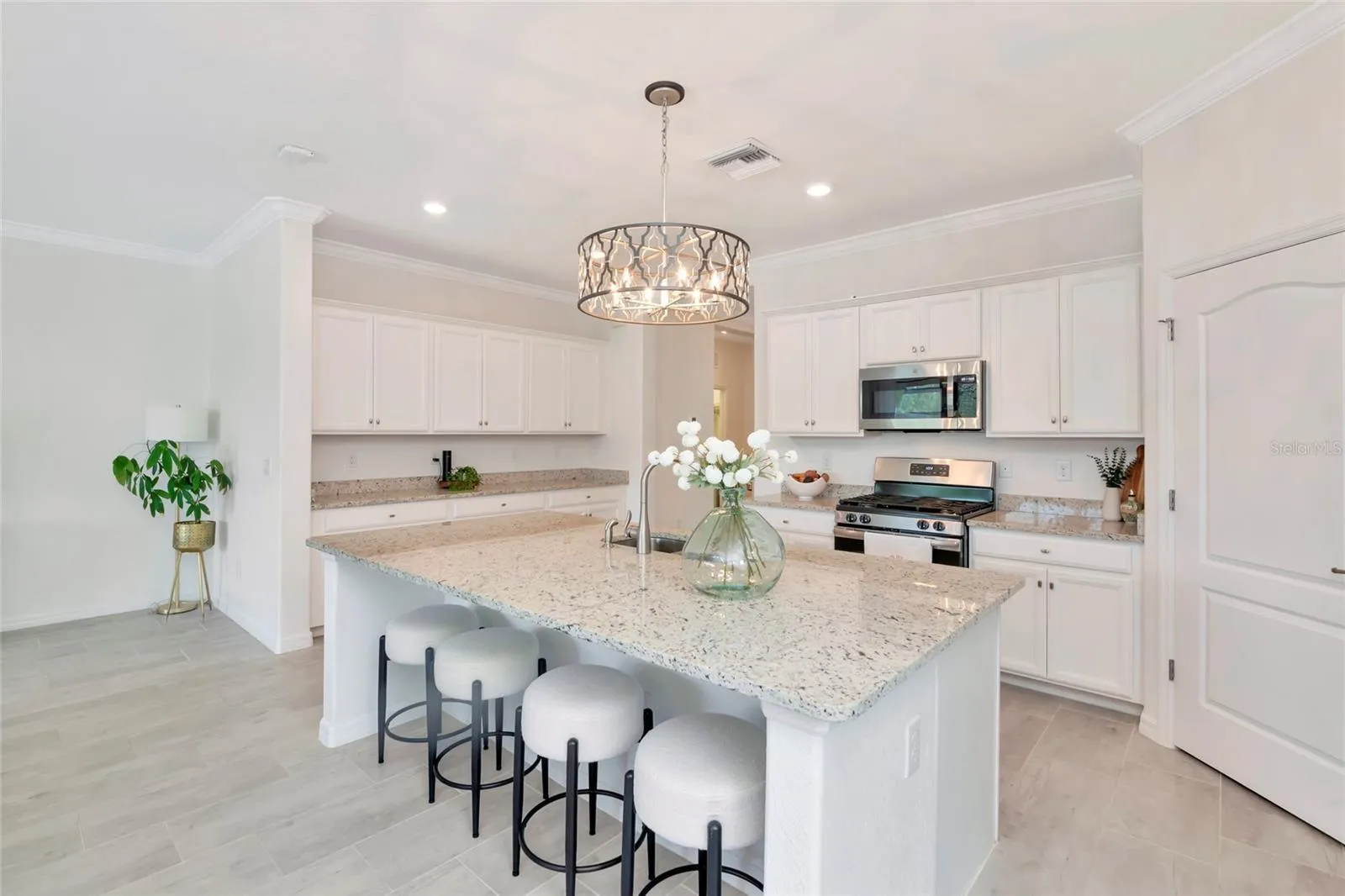 - Ceiling Fans(s), Crown Molding, Open Floorplan, Thermostat, Walk-In Closet(s), Eat-in Kitchen, Kitchen/Family Room Combo, Primary Bedroom Main Floor, Split Bedroom, High Ceilings, Stone Counters, Solid Wood Cabinets, In Wall Pest System