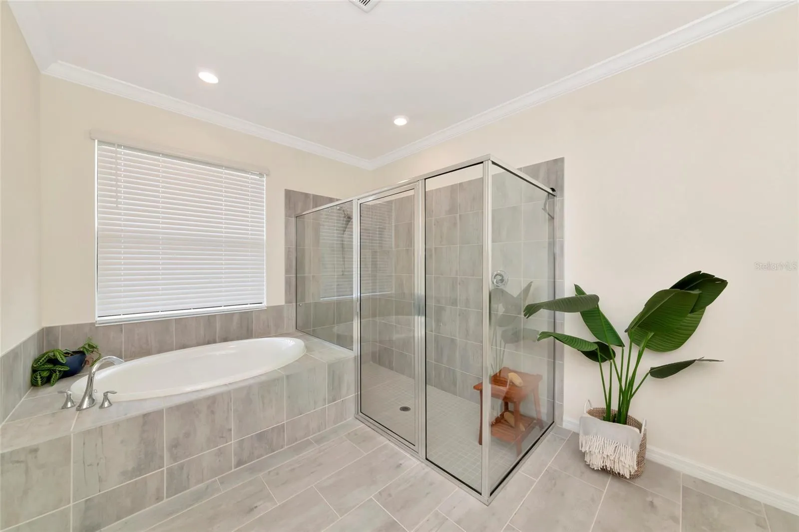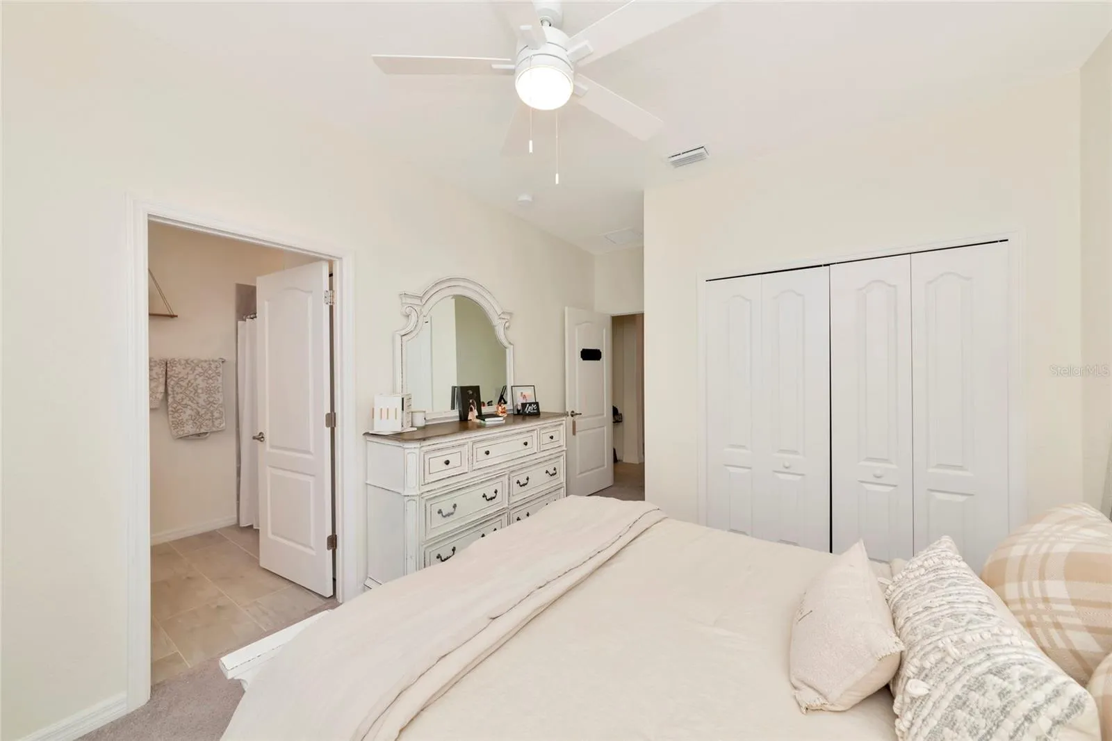 Inside, the home is in excellent condition with tile flooring throughout the main living areas, painted wood cabinetry, and granite countertops. The layout is efficient and easy to live in, whether full-time or seasonal. The primary suite includes a large walk-in closet, while the primary bath offers dual vanities, a garden tub, and a separate walk-in shower.