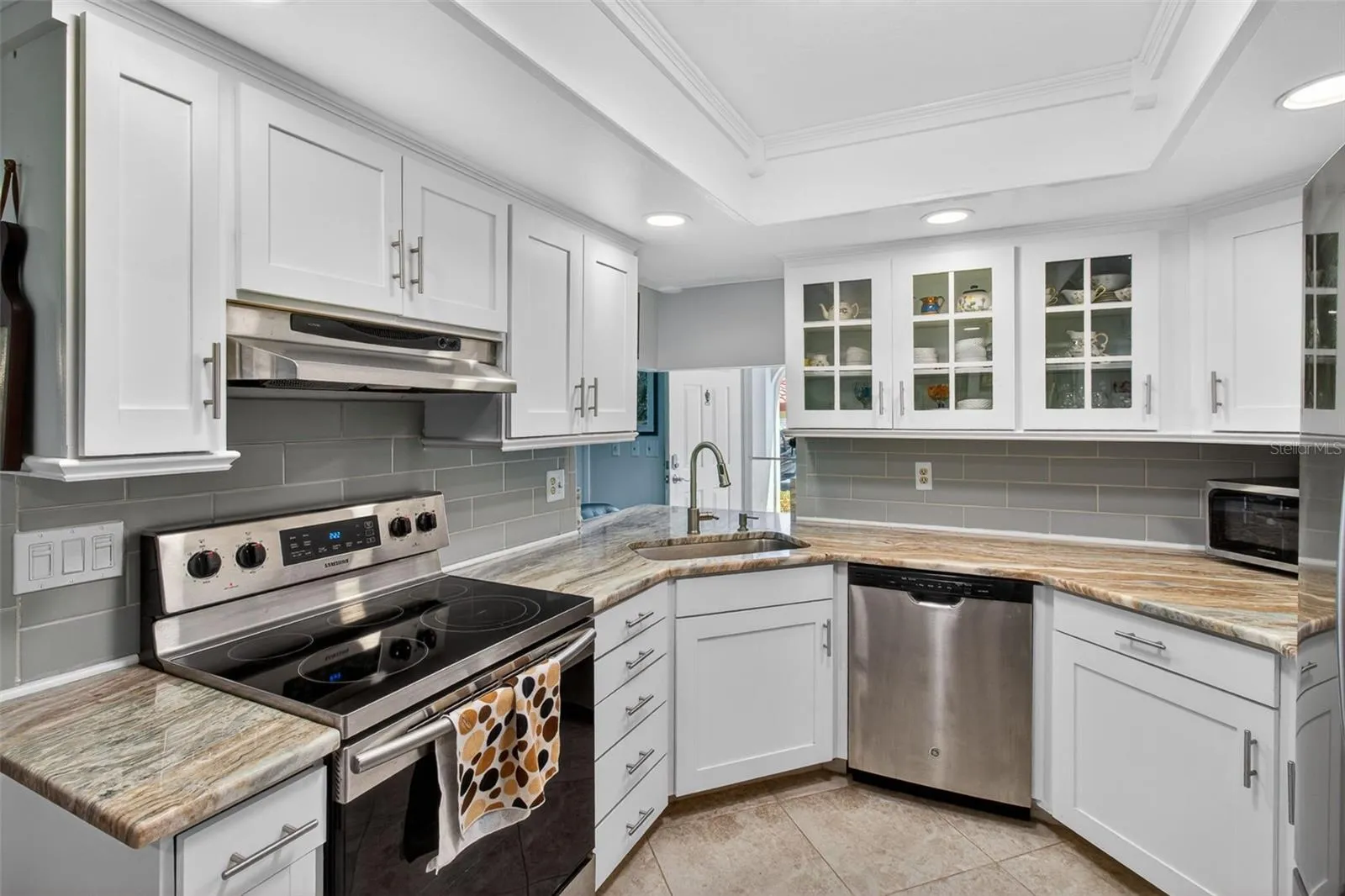Welcome to Village on Lake Seminole, a beautifully maintained Mediterranean-style waterfront community set along the shores of Lake Seminole. With its bright white buildings, red tile roofs, and lush, manicured landscaping, this community offers standout curb appeal and a relaxed Florida lifestyle. This updated 2-bedroom, 2-bathroom ground-floor end unit is light, bright, and move-in ready, featuring high-end wood-look laminate flooring throughout. The spacious layout includes a combined living and dining area with a cozy wood-burning fireplace, perfect for both everyday living and entertaining. The white kitchen has been fully updated with granite countertops, stainless steel appliances, and solid wood cabinetry. Both bedrooms are generously sized, with the primary suite offering a large walk-in closet and an updated en-suite bathroom. A convenient in-unit laundry room adds everyday practicality. Enjoy outdoor living with both front and rear patios—ideal for relaxing on warm Florida evenings. Residents have access to a community pool and dock, both overlooking Lake Seminole. The unit also includes a covered parking space and additional storage. Monthly maintenance fees cover water, sewer, trash, cable, and internet, providing added value and convenience. Ideally located just minutes from the shops, restaurants, and entertainment of Seminole City Center, and a short drive to the Gulf beaches, this property offers the perfect combination of comfort, convenience, and lifestyle.