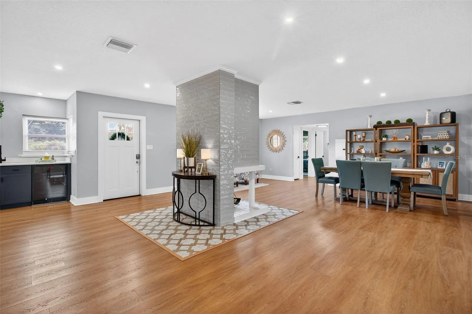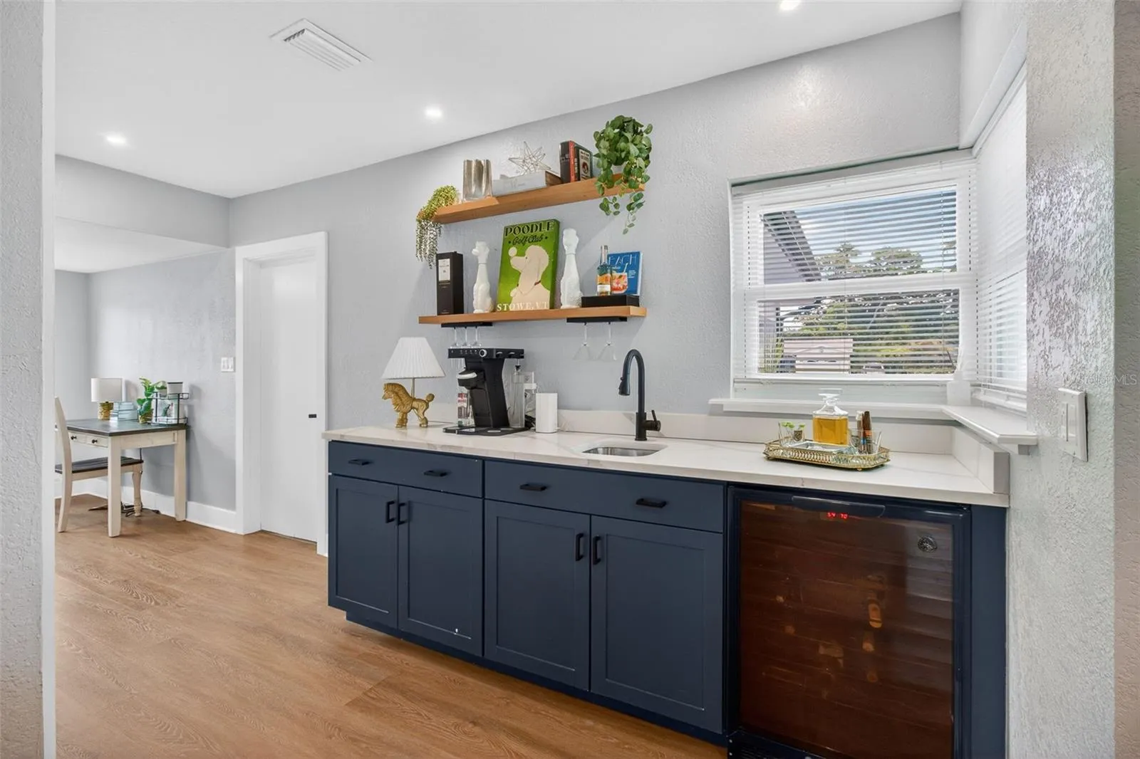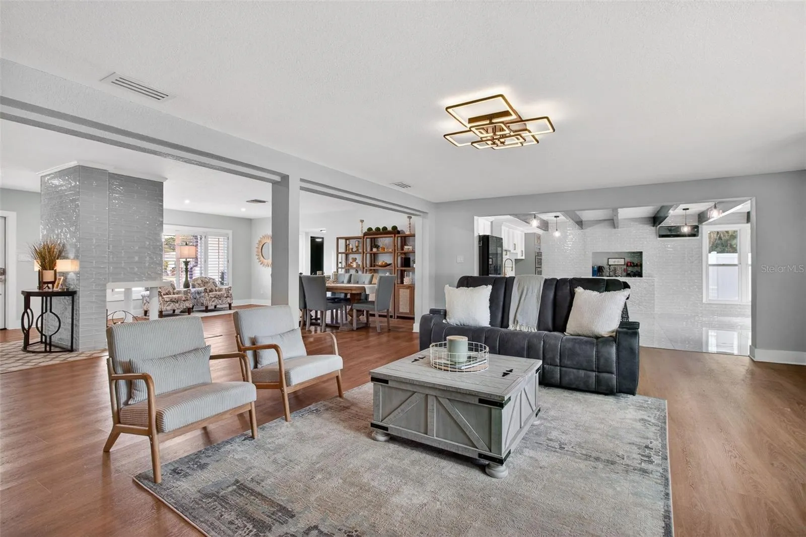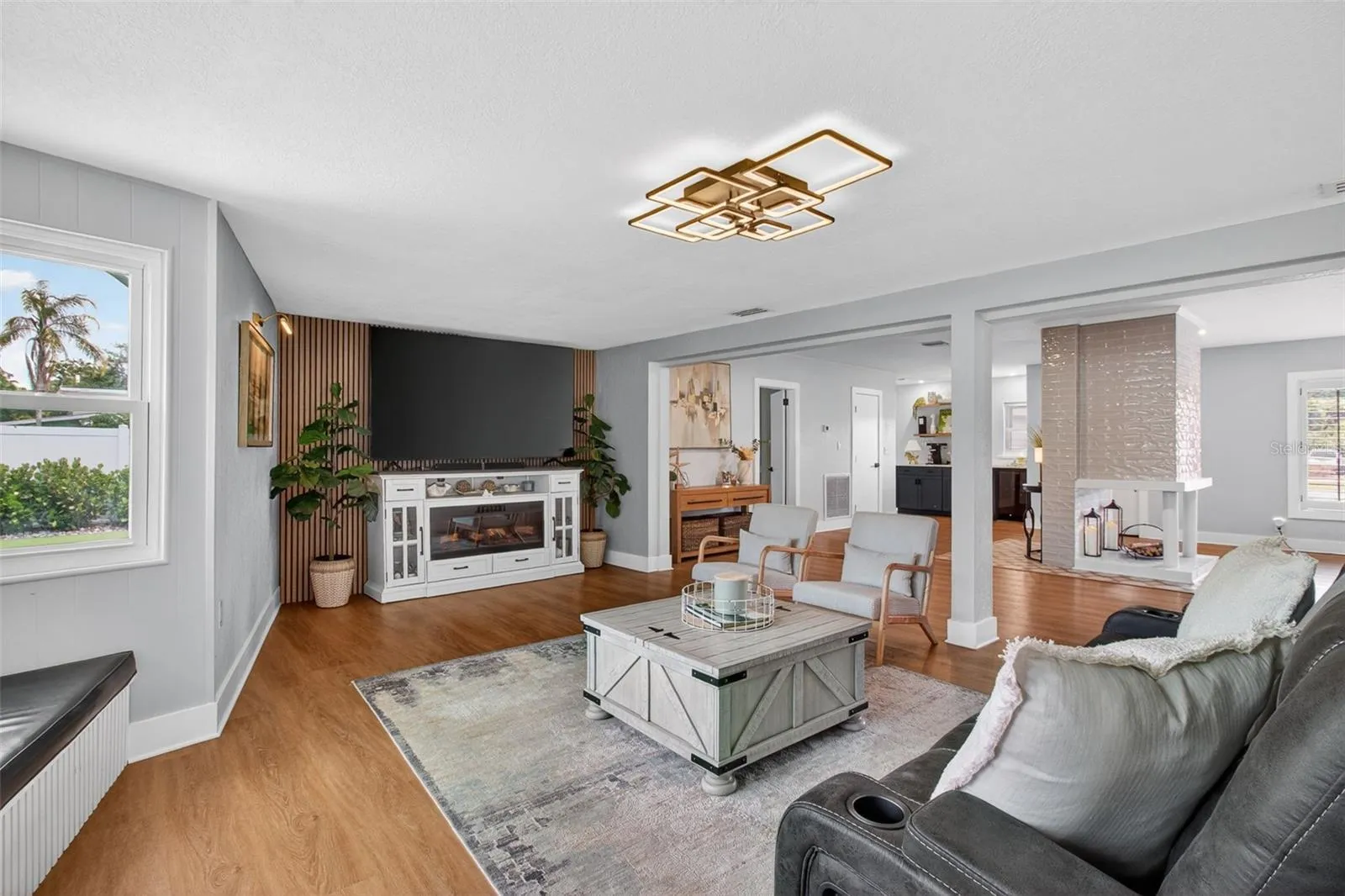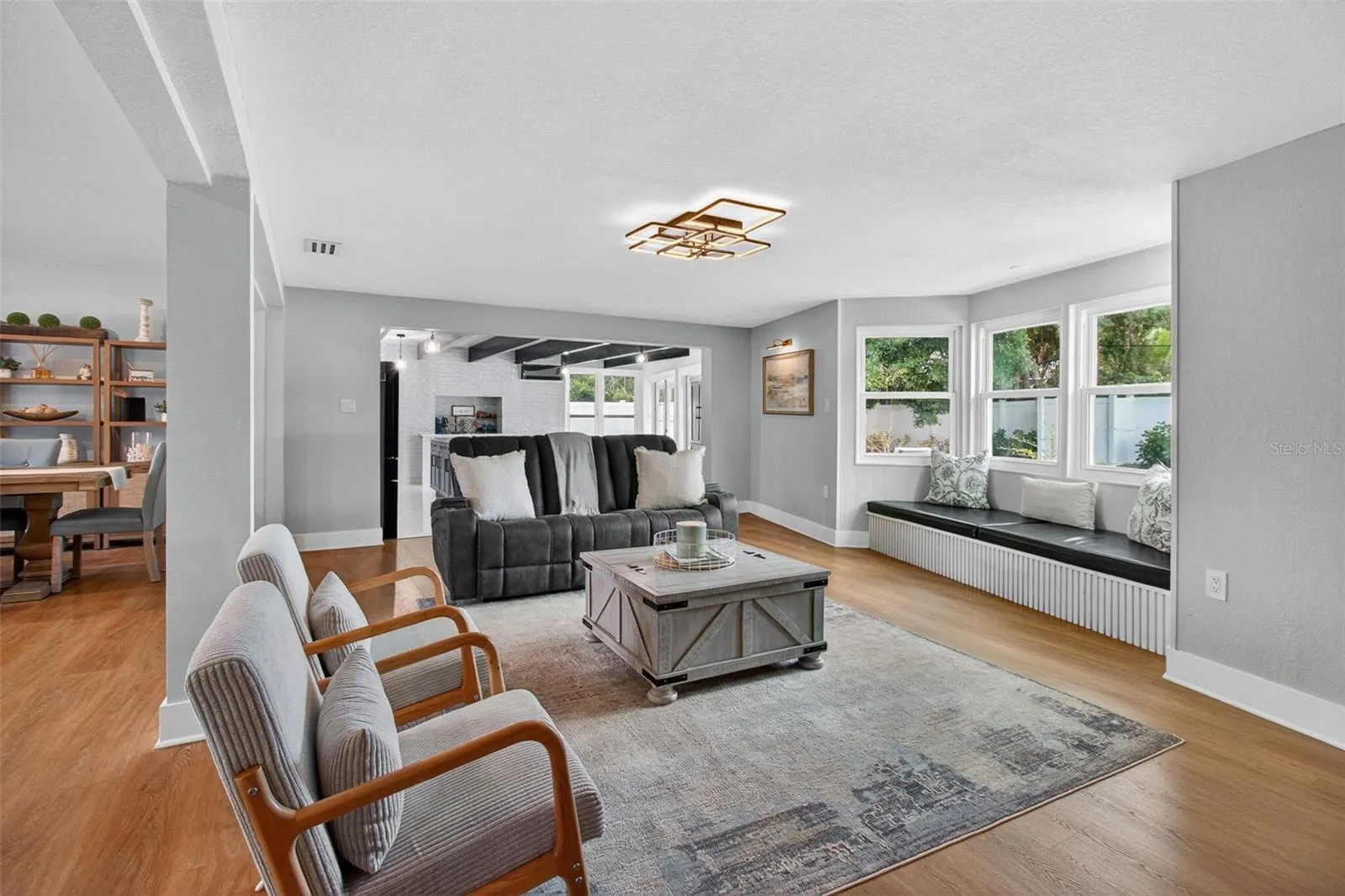 One or more photo(s) has been virtually staged. WELCOME HOME!! Discover this refined, 3 bedroom 2 full bathroom move-in-ready home in the heart of Belleair. Set on a generous .28-acre lot a stone’s throw from Pelican Golf Course and minutes from the renowned Belleair Country Club, this beautifully updated modern residence blends thoughtful design with high-end systems and finishes. Enter into bright, open living spaces graced by light oak luxury vinyl floors and a striking wood-panel centerpiece. The kitchen is a chef’s delight — exposed beams, a striking veneer accent wall, large center island, quartz countertops, built-in oven/microwave and brand-new stainless-steel appliances — flowing directly to an ample back patio for effortless indoor/outdoor living and entertaining. A dedicated wet bar enhances hosting possibilities. The primary suite is a restful retreat with a sizeable walk-in closet and a spa-like en suite featuring dual vanities and a spacious glass-enclosed walk-in shower. A practical split-plan places two guest bedrooms on the opposite side of the home with a beautifully renovated full bath. Practicality meets peace of mind with the property located NOT IN A FLOOD ZONE and extensive recent infrastructure upgrades: new metal roof with 2025 upgrades, solar panels, new electrical mast and grounding, upgraded electrical throughout, new HVAC (2025/26), new water heater, new hurricane-proof front and garage entry doors, ductless mini-split in the kitchen, updated ductwork, new tile and appliances in the kitchen, new closet systems, full turf and landscaping, exterior pressure wash and paint (2026), and more. Beyond the home, enjoy immediate access to Belleair’s best — beaches, Belleair Market and Publix, fine dining, parks, boat ramp, dog beach, and Morton Plant Hospital. Whether you’re seeking an elegant primary residence or a luxurious second home, this property offers exceptional value in one of Belleair’s most desirable locations. Don’t miss this opportunity — schedule your private showing today.